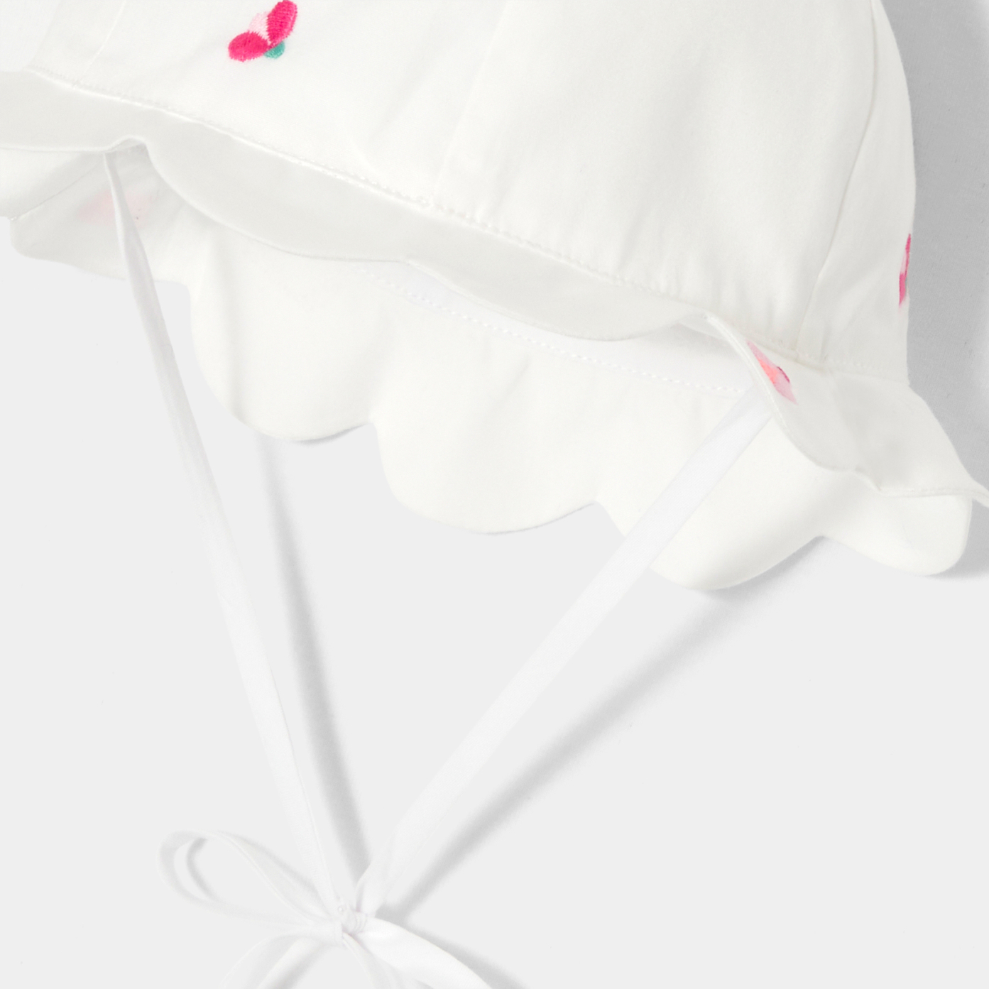 In cotton poplin embroidered with ladybugs, this baby girl hat will protect the little one with originality all summer long. Scalloped and with ties, it will match the clothes of the collection.- Organic cotton baby girl hat- Embroidered ladybirds- Scalloped brim- Ties - Birth gift idea to offer or to treat yourself.