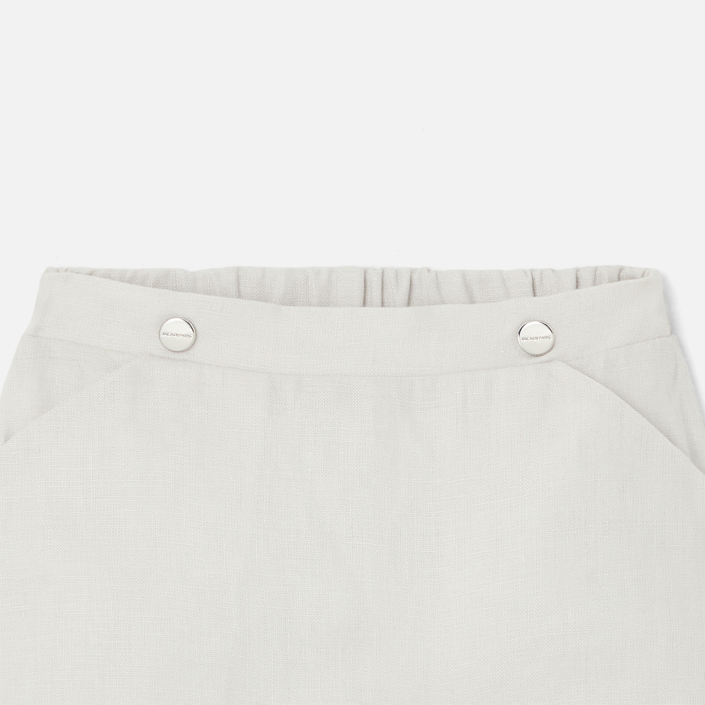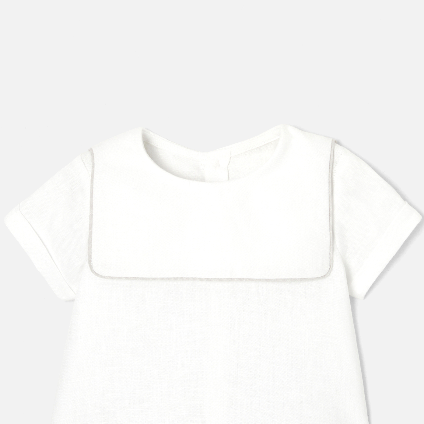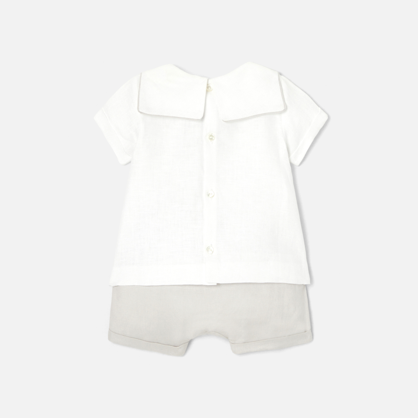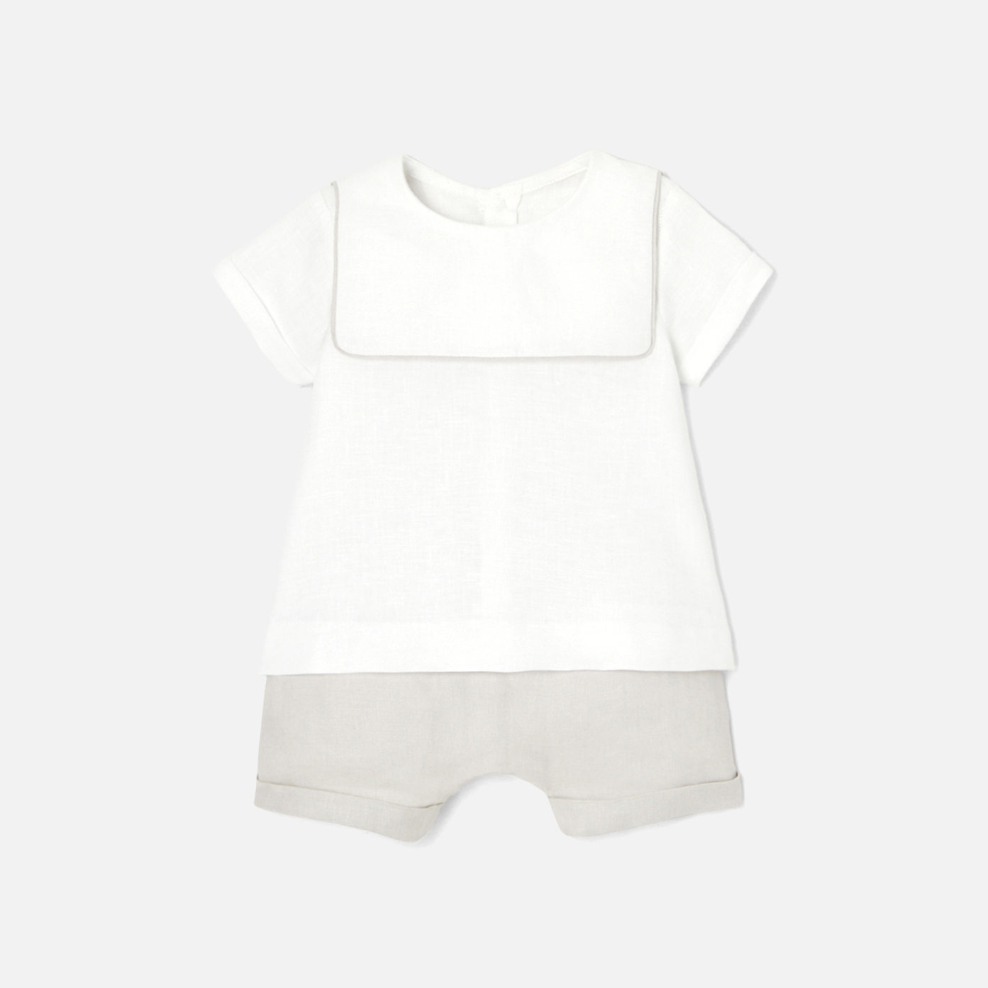 An elegant linen set for a newborn baby's first summer. Combining a linen t-shirt with contrasting piping on the navy collar and lined shorts with decorative snaps, it will make a perfect formal outfit.- Linen baby shorts set- Navy collar with contrasting piping- Back press stud opening- Elasticated waist shorts- Decorative tab press studs - Lovely birth gift idea
