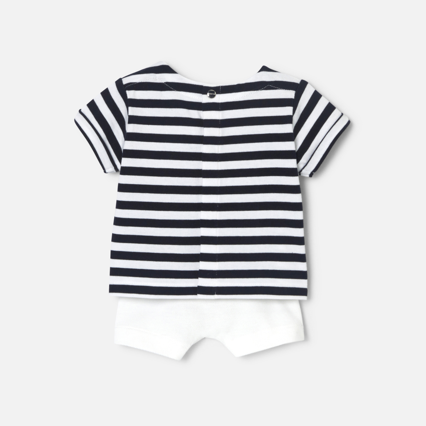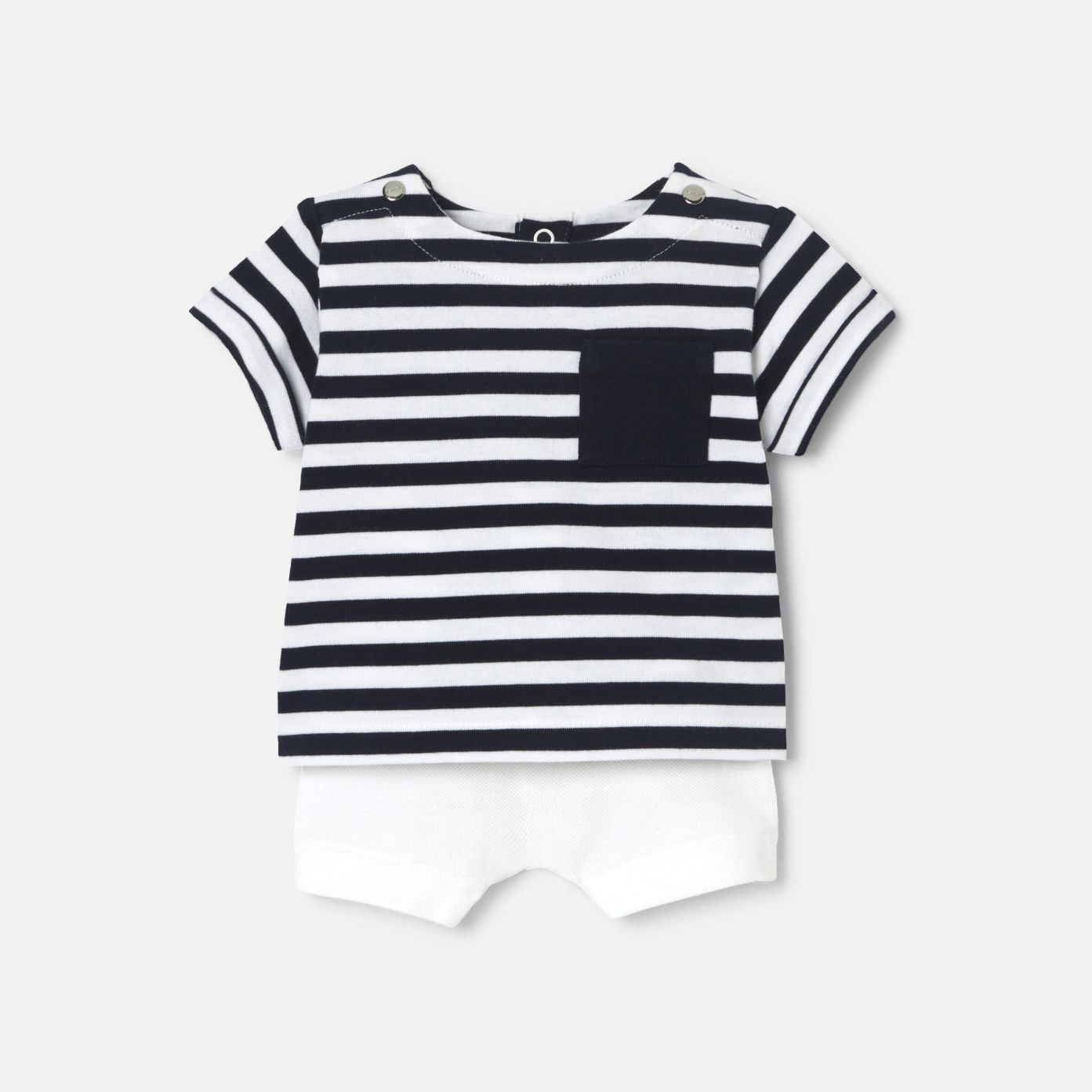 The perfect gift for a newborn baby's first summer, this chic seaside ensemble is made up of a Breton t-shirt and cotton piqué shorts. Designed for easy dressing thanks to its back snap opening and elasticized waist, this duo will find its place in his wardrobe.- Boy set in organic cotton- Sailor T-shirt with back snap opening- Patch pocket on chest- Shorts with elasticized waist - Great birth gift idea