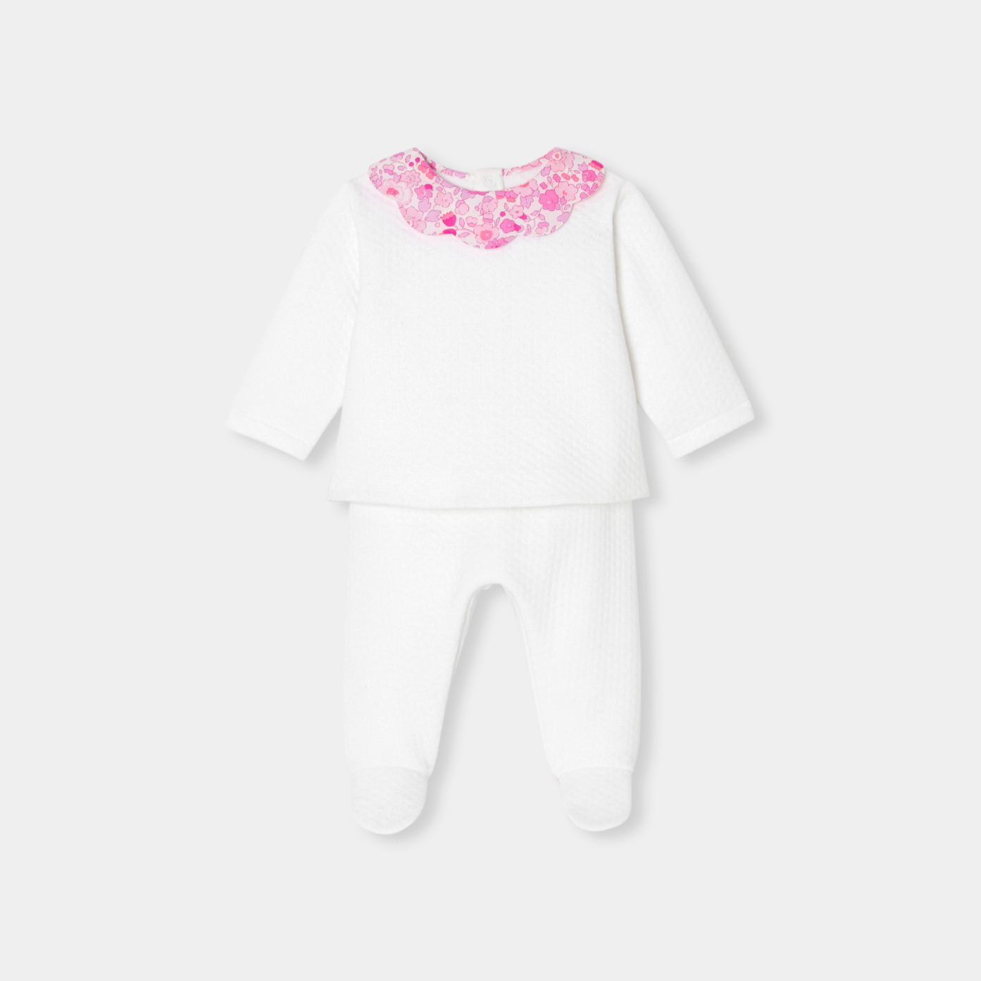 The trousseau is enriched with chic, functional garments like this comfortable baby girl set in double jersey. Comprising a top with a scalloped yoke in Liberty fabric and elasticated trousers with feet, this practical, well-thought-out duo will accompany the little one from spring onwards with elegance and originality.-Baby girl set in double jersey-Long-sleeved top-Scalloped collar in Liberty Betsy fabric, exclusive Jacadi colouring-Snap-back opening-Footed trousers with elasticated waist-Great idea for a baby gift, either for yourself or as a present.
