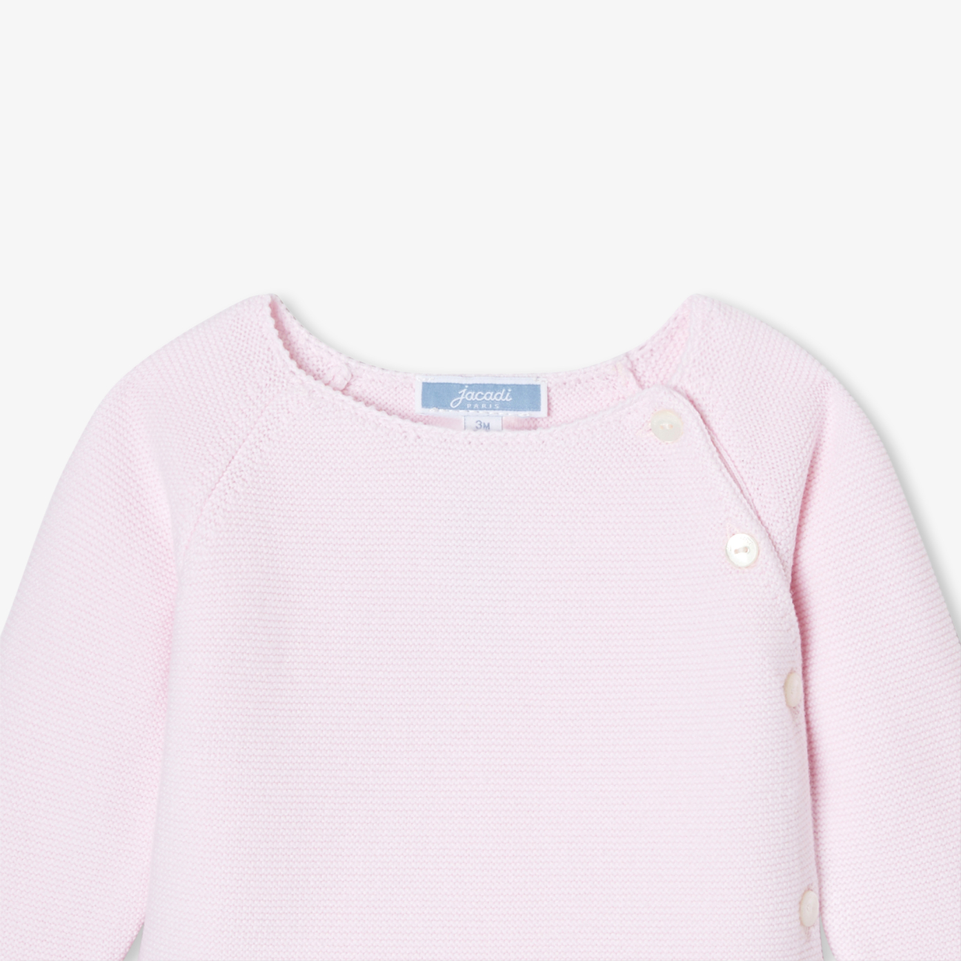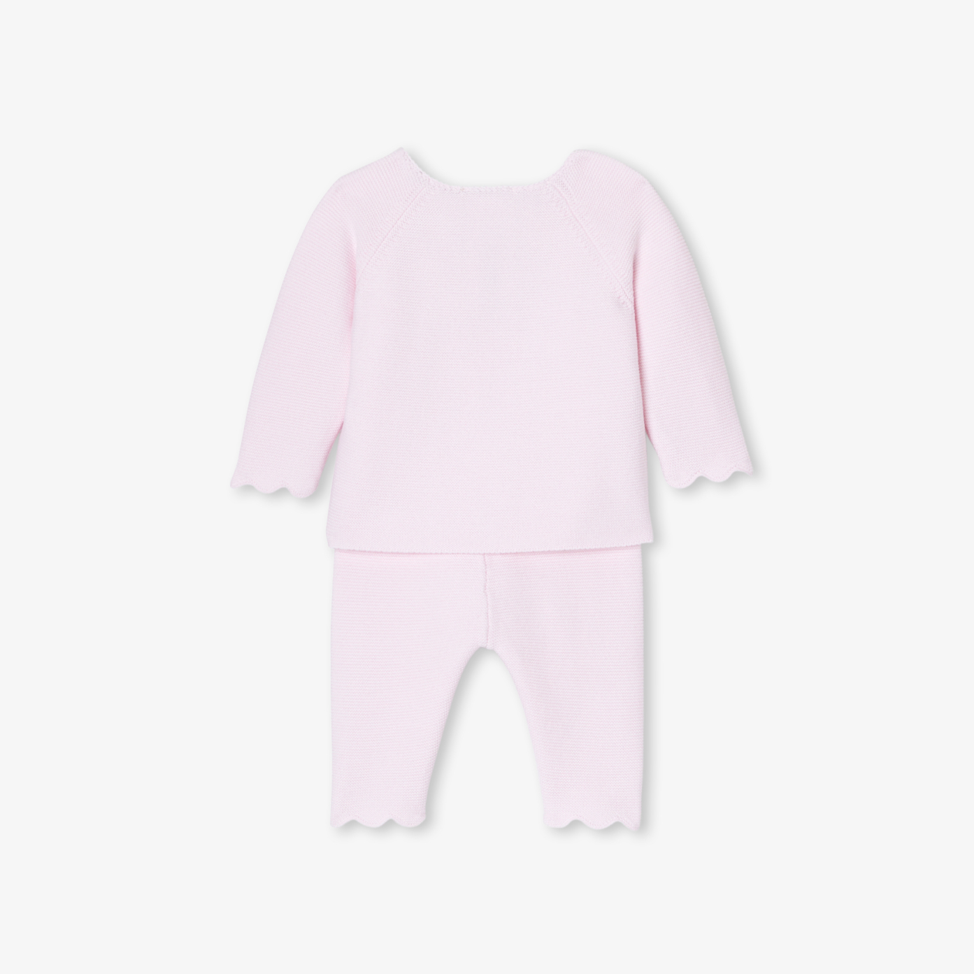 Chic and authentic, this baby girl set strikes just the right balance between elegance and comfort. Made from organic cotton, its supple garter stitch knit will provide baby with softness and protection from the very first days. Easy to slip on thanks to its front button fastening and elasticated waistband, this set with its pretty scalloped details is a great idea for a first outfit and birth gift.- Baby girl organic cotton set- Scalloped finishes- Natural mother-of-pearl button front opening- Elastic waist trousers- Ideal for a first outfit or birth gift