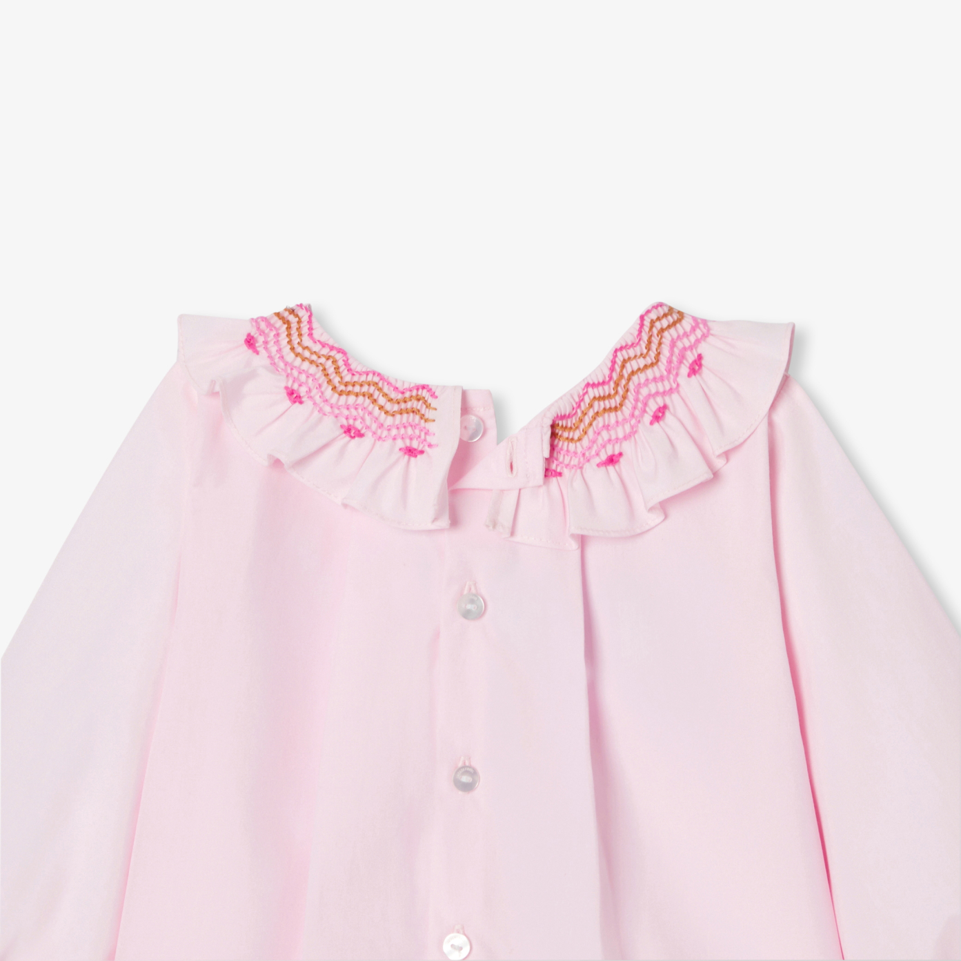 This baby girl blouse seduces with its intricate details. In cotton poplin, a delightful collar with hand-embroidered smocking transforms this piece to match a pinafore dress or trousers for a chic, authentic silhouette.- Baby blouse in organic cotton poplin- Smocked collar with multicolour hand-embroidery- Round pleats in front- Elasticated cuffs- Buttoned back opening