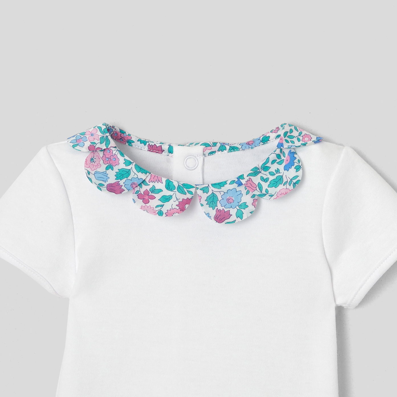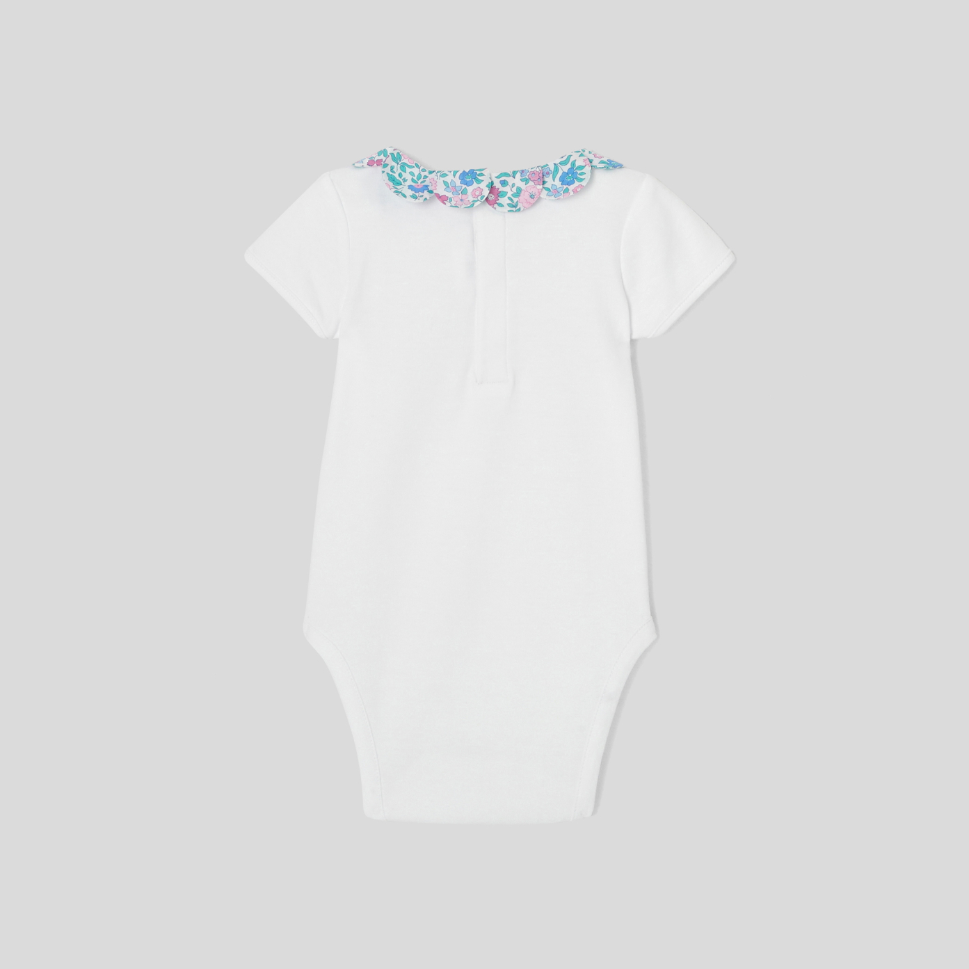 Made from soft organic cotton to keep baby's skin comfortable, this bodysuit with an elegant Liberty print petal collar is an instant favourite. An ideal first summer outfit for your little one, this bodysuit will be perfect with bloomers or a solid dress. - Organic cotton - Poplin petal collar - Snap button fastener in the back and between the legs - Jacadi exclusive Liberty Vita colourway