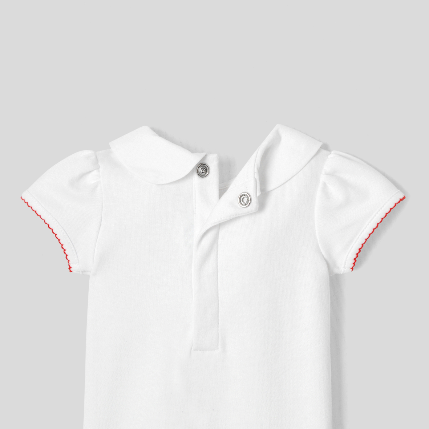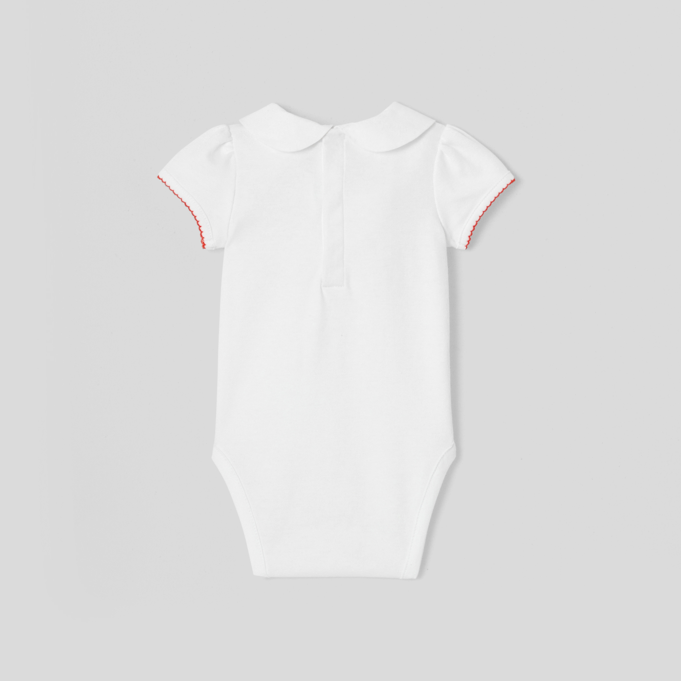 Made of organic cotton and accessorised with a hand-embroidered Peter Pan collar, this baby girl bodysuit has balloon sleeves with picot finishes for a more modern look. Opening at the back and crotch with snaps, it will match perfectly with a dress or a bloomer as soon as summer comes.- 100% organic cotton baby bodysuit- Embroidered poplin Peter Pan collar- Balloon sleeves with picots- Press studs at the back and crotch - Nice newborn gift idea or for yourself
