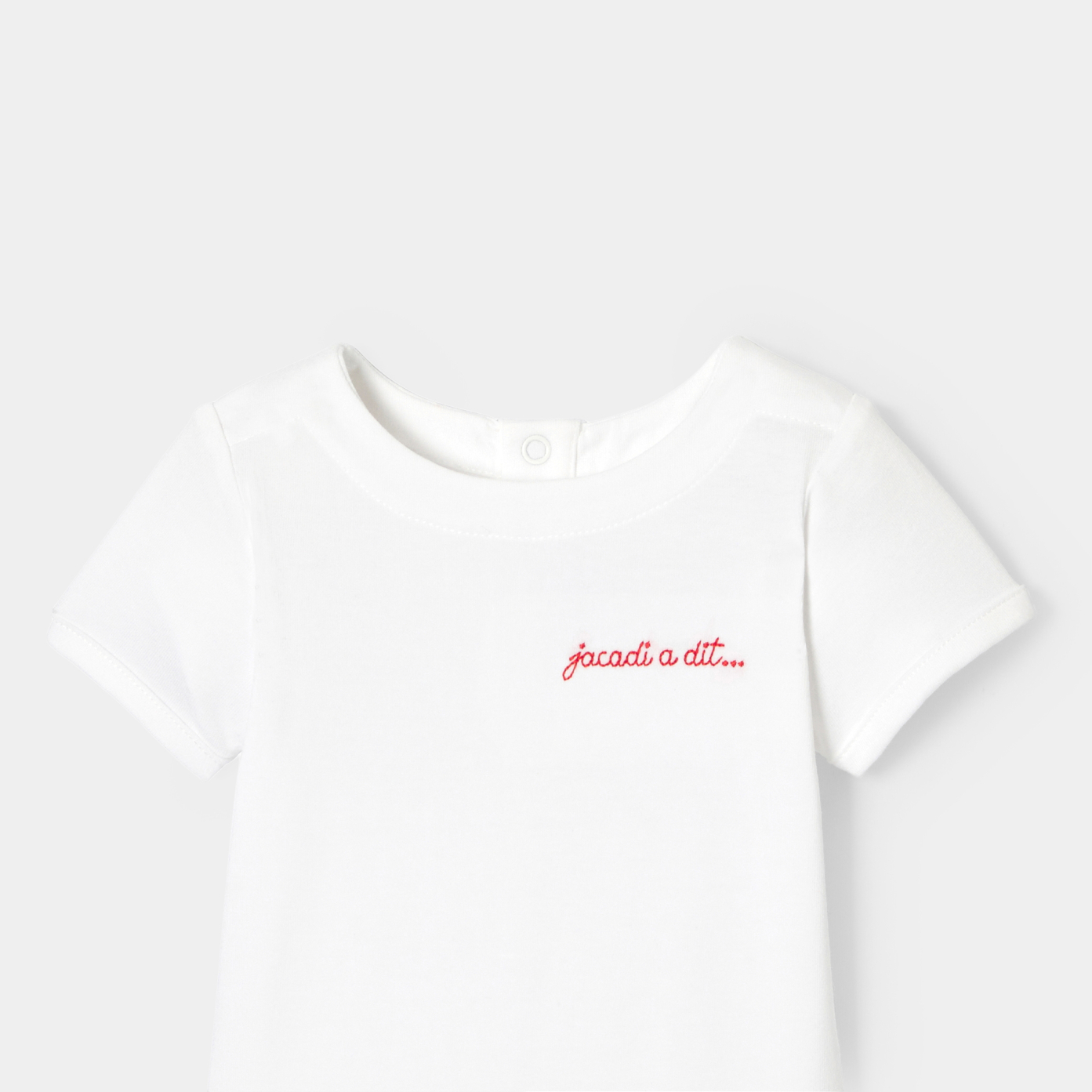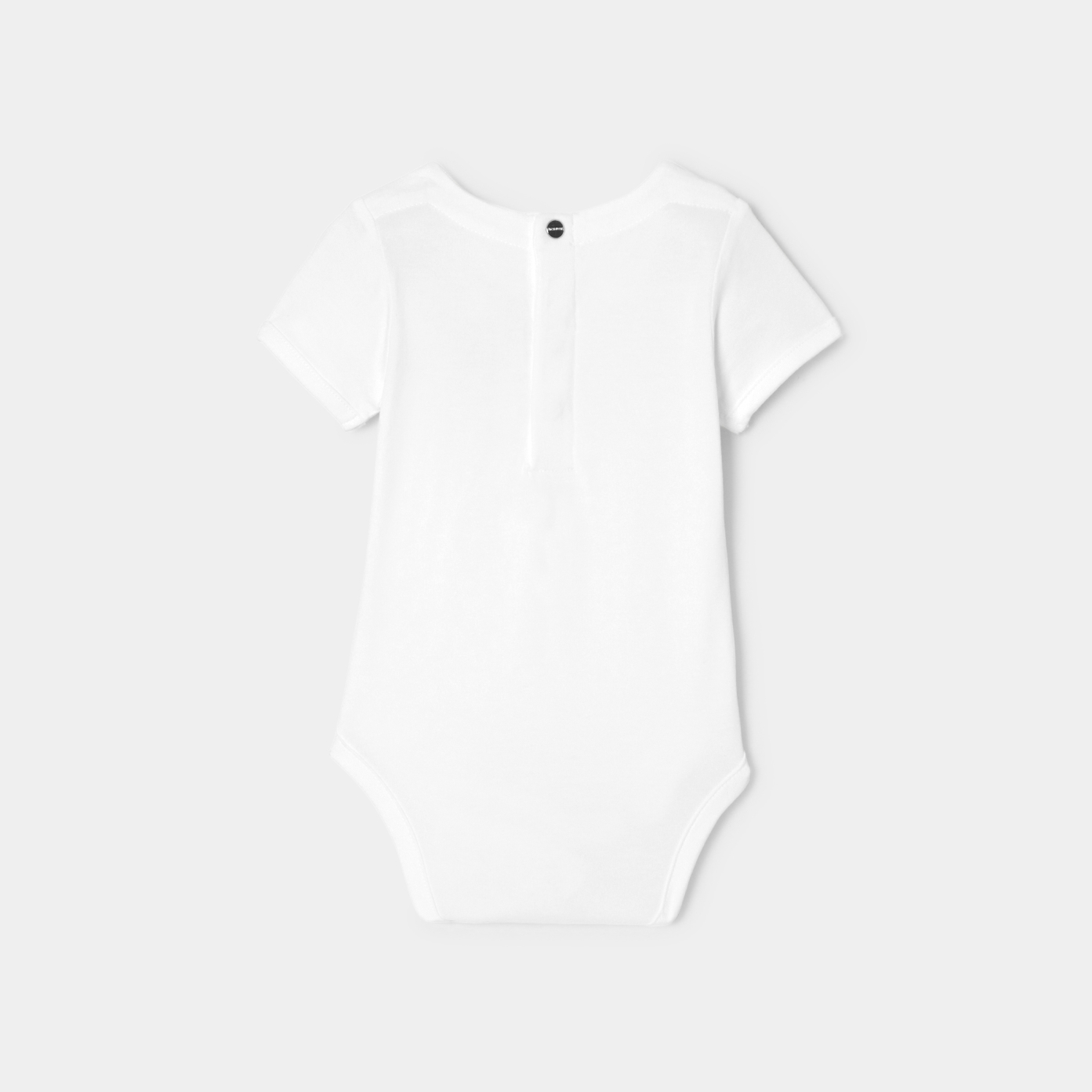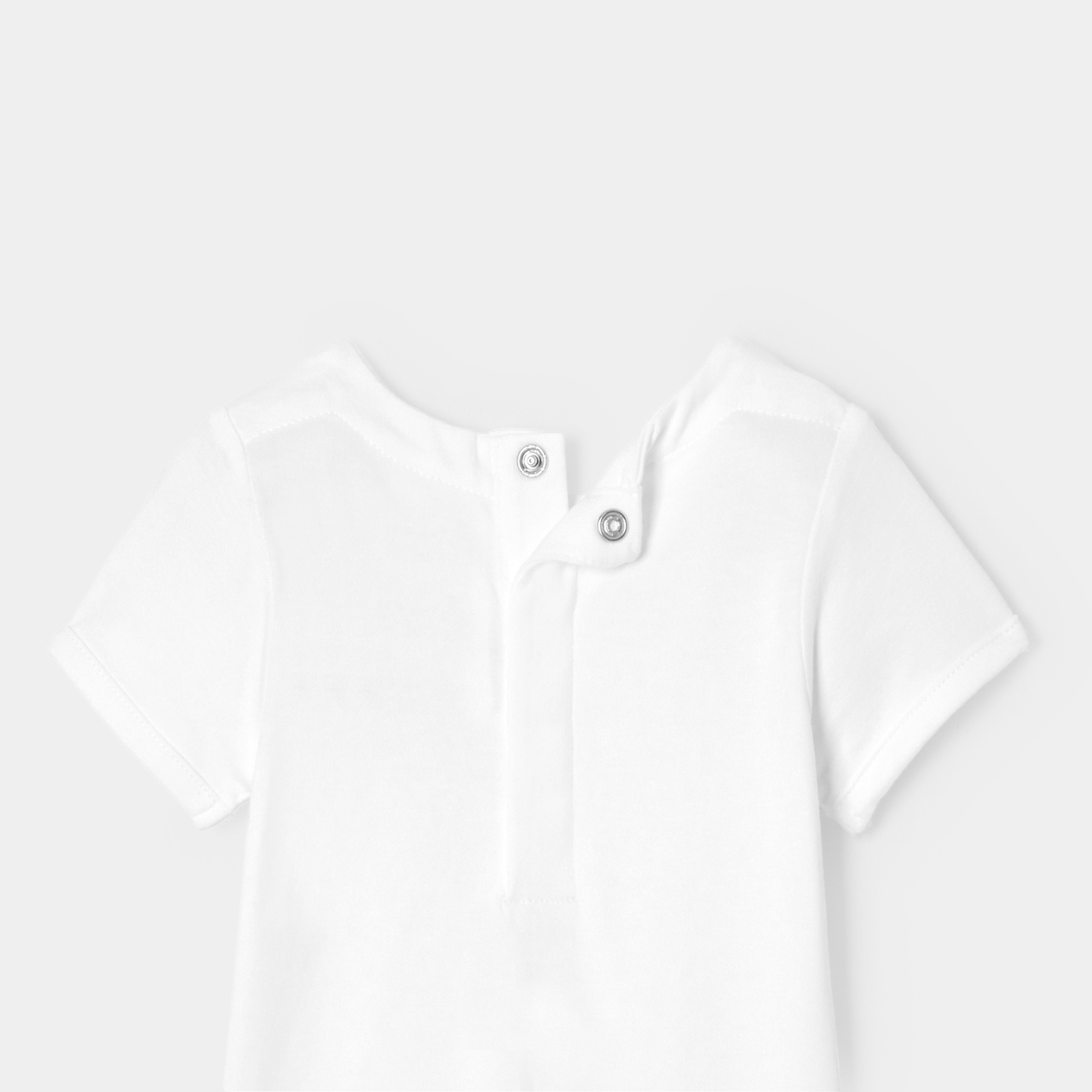 A new design in the Jacadi wardrobe, this baby boy bodysuit takes the form of a short-sleeved t-shirt for spring. Embroidered on the front panel and easy to slip on thanks to its snap openings, it will pair nicely with a romper and be discreet under a sweater.- Organic cotton baby bodysuit- Round neck- Short sleeves- Jacadi a dit embroidery- Back and crotch snaps