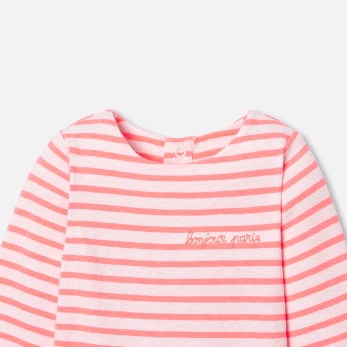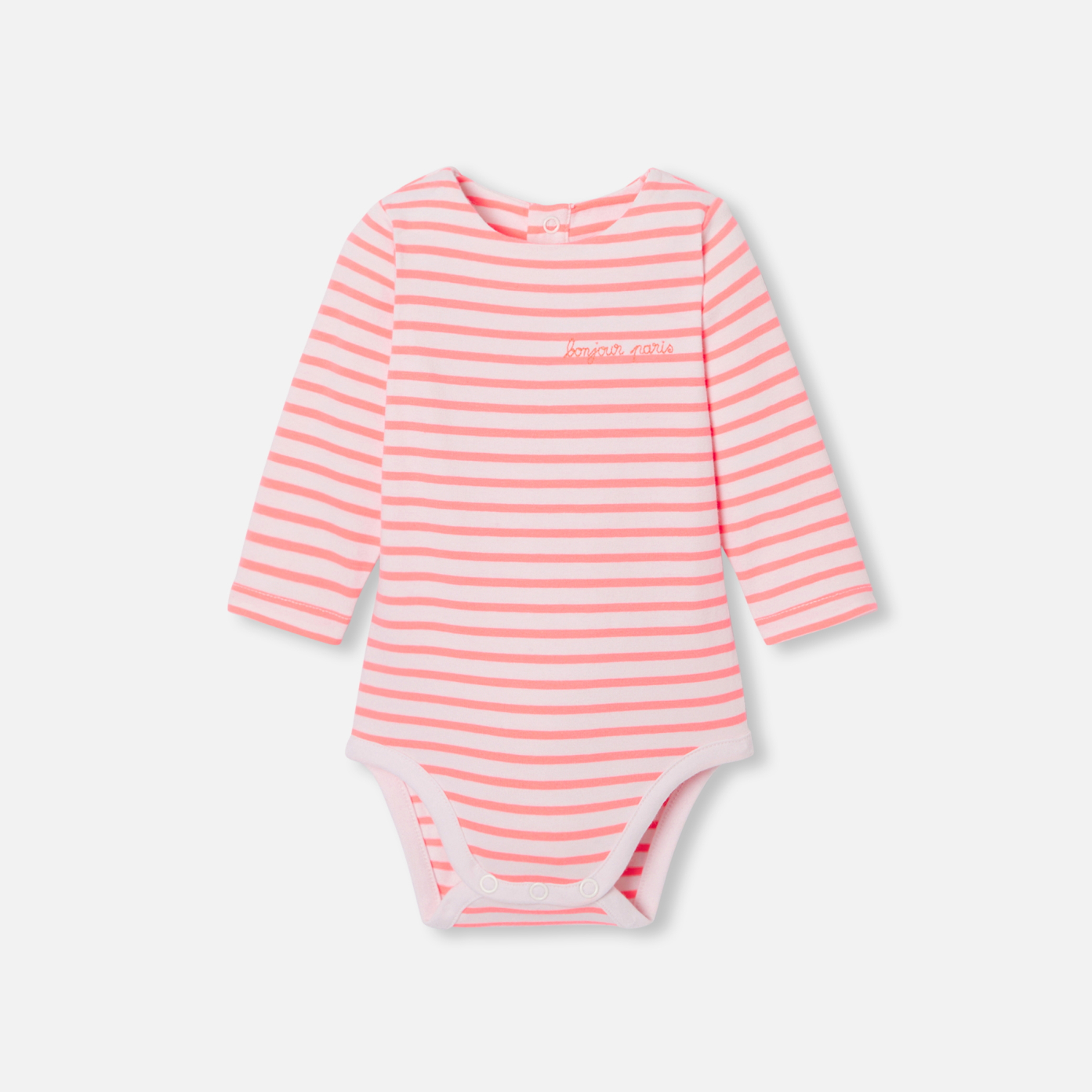 Ideal for the start of the season thanks to its soft, covering jersey, this long-sleeved baby girl bodysuit features a chic, modern striped print. Embroidered with a message on the chest and opening with press studs and crotch, opt for light denim overalls and little leather booties for a silhouette with Parisian charm.- Long-sleeved bodysuit in jersey- Round neck- Embroidered message on chest- Press studs on back and crotch