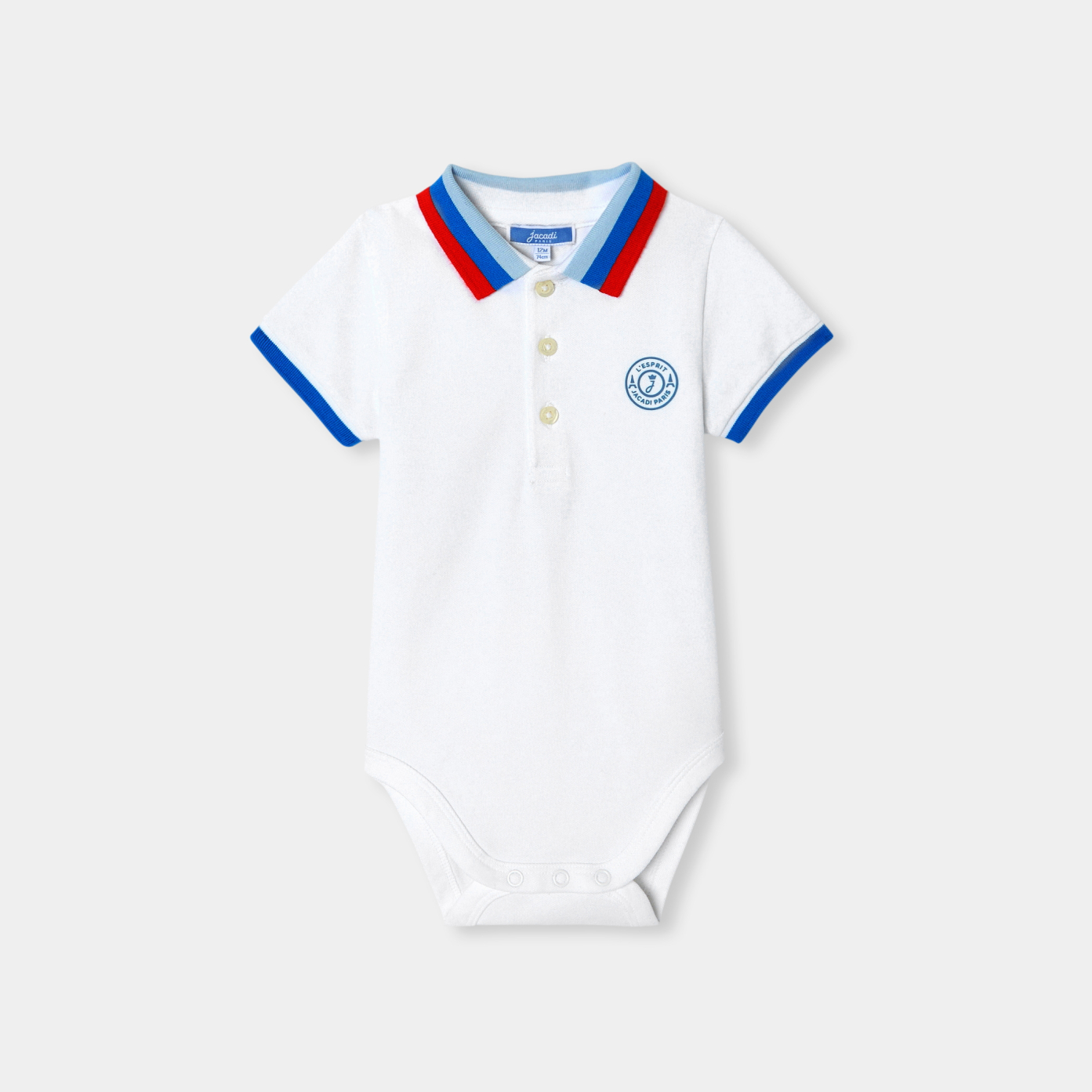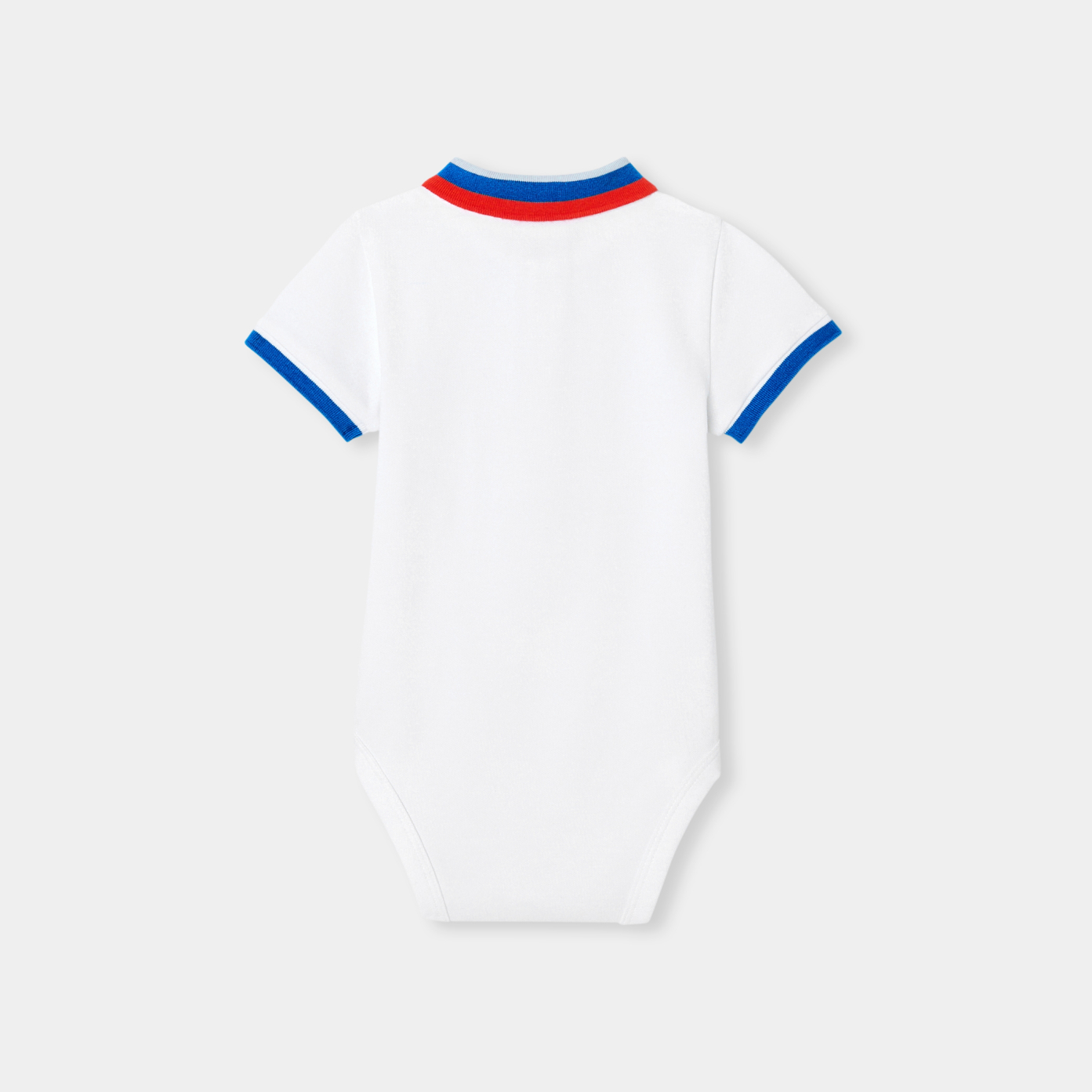 This polo shirt invites itself into the toddler spring wardrobe in the form of a polo shirt for a chic casual look. Contrasting striped collar and cuffs, button placket at neckline and press studs at crotch complete this model, to be worn with twill trousers from spring and shorts until the end of summer.-Baby boy body in organic cotton-Piqué knit-Polo collar and ribbed cuffs-Button placket at neckline-Press studs at crotch