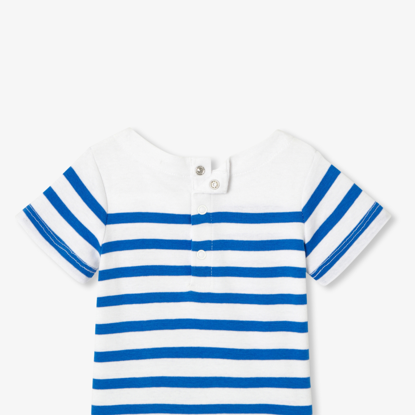 Give him his first Breton tee by choosing the comfort and originality of this baby boy bodysuit. Cut like a t-shirt and printed on the front, it can be worn under dungarees in spring or with shorts for the vacations and is easy to put on thanks to its press stud opening.-Baby sailor bodysuit in organic cotton-Short sleeves-Jacadi Paris print on chest-Press stud opening at crotch