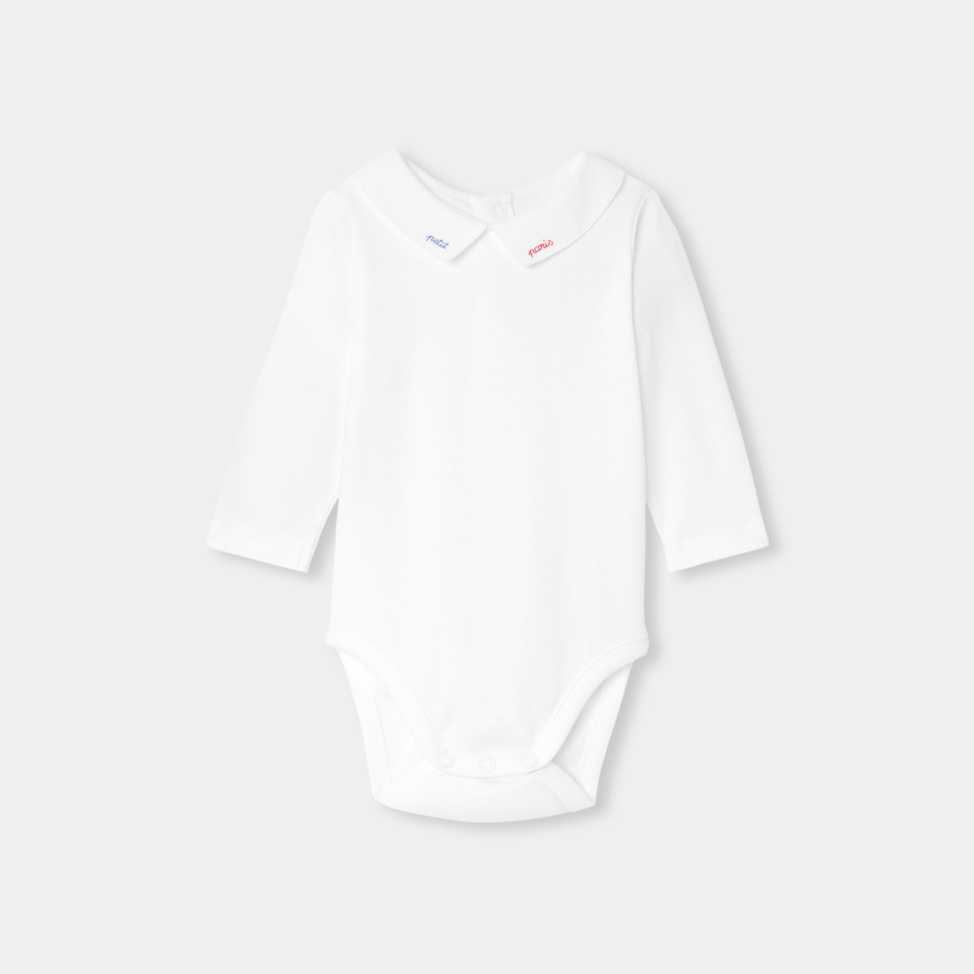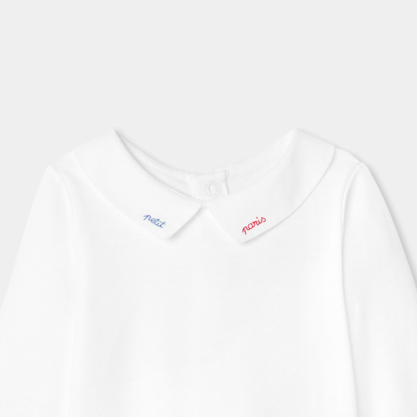 Elegance meets everyday wear with this baby bodysuit in soft, supple organic cotton. Adorned with a collar embroidered with the message Petit Paris and press studs at the back and crotch for easy dressing, pair this essential with overalls and a cardigan for a chic, city casual silhouette.- Long-sleeved bodysuit in organic interlock cotton- Hand-embroidered poplin collar- Press studs at back and crotch