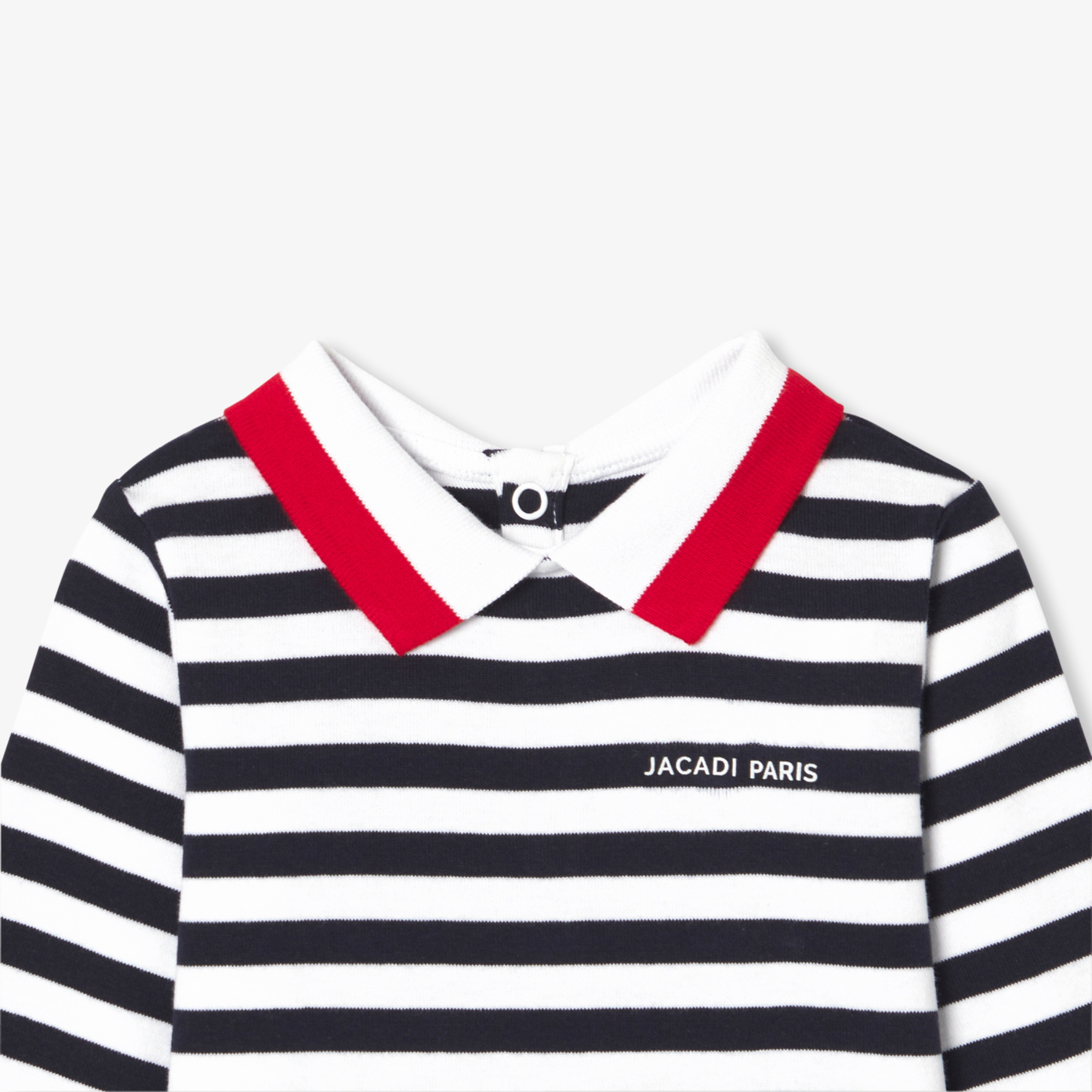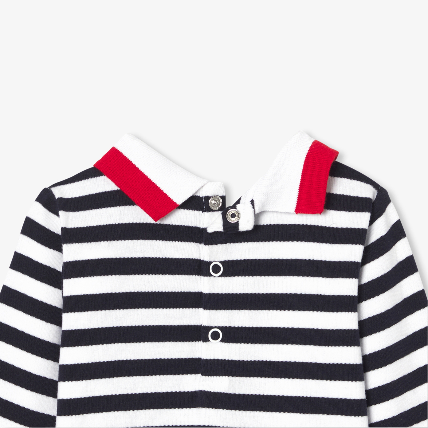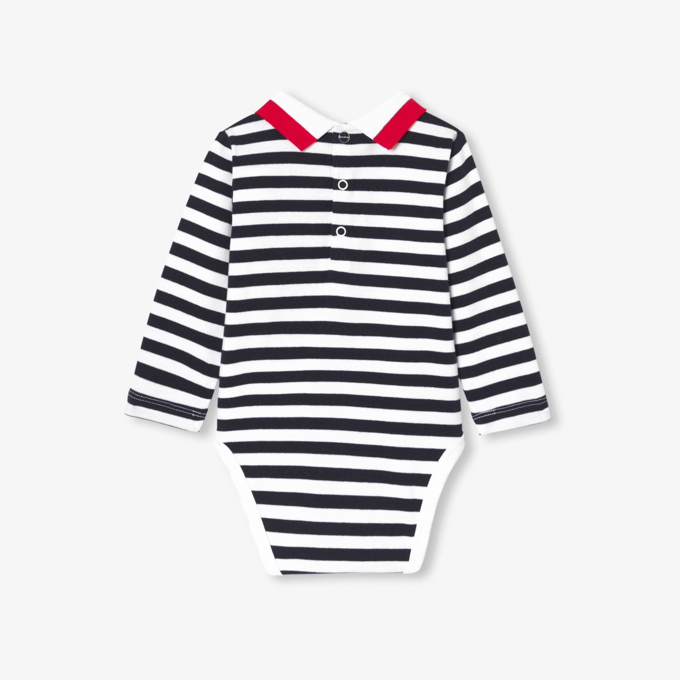 A polo spirit with a two-tone rib collar and classic stripes, this baby boy bodysuit is made from soft, supple organic cotton. Easy to match with jeans or dungarees, this sporty chic basic opens at the back and crotch for easy dressing. An essential, perfect for baby's wardrobe.- Long-sleeved bodysuit in organic cotton- Ribbed polo neck- Press stud opening at back and crotch