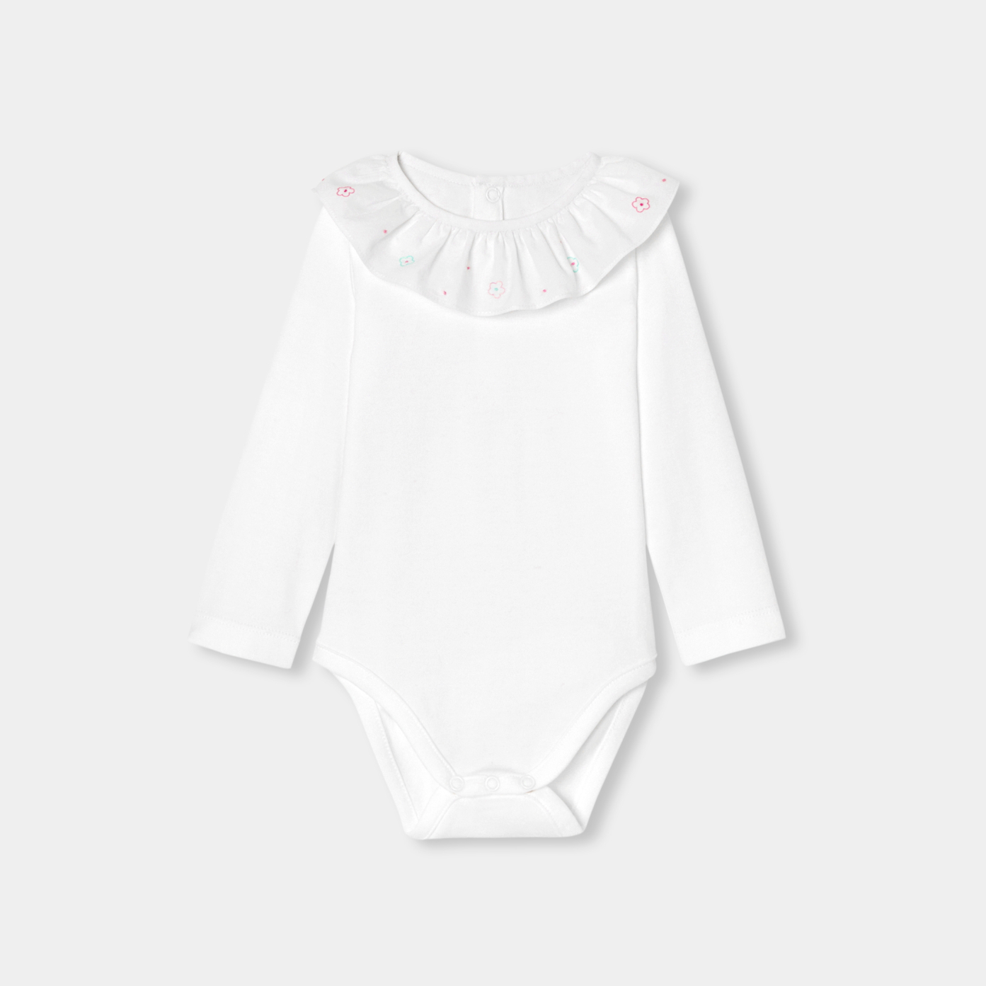 With a hand-embroidered ruffle and soft organic cotton, this baby girl bodysuit promises elegant everyday comfort. Long-sleeved and easy to slip on, this model, to be worn from autumn onwards, will go equally well with overalls or velvet shorts.- Organic cotton baby girl bodysuit- Long sleeves- Hand-embroidered poplin ruffle- Press studs at back and crotch.