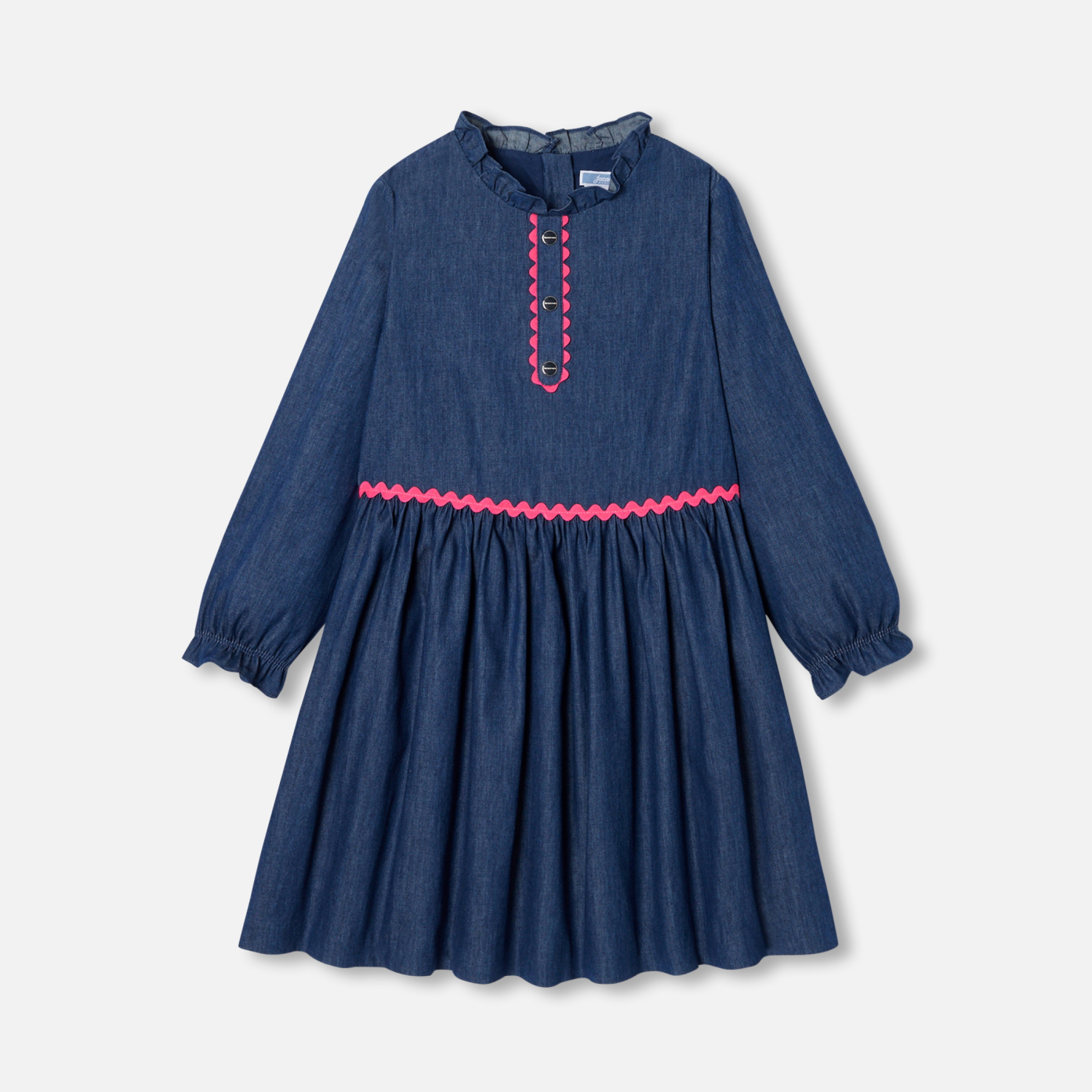 Season after season, Jacadi creates irresistible pieces with a romantic charm, like this gjrl dress. A timeless wardrobe staple revisited in soft denim for a contemporary silhouette, ruffles at the neckline and bottom of the sleeves and pink croquet ribbon add a modern touch to this model, perfect for back-to-school.- Girl lightweight denim dress- Long sleeves- Ruffled collar and cuffs- Trompe-l'oeil button placket- Pink croquet ribbon- Lining- Invisible zip opening at back
