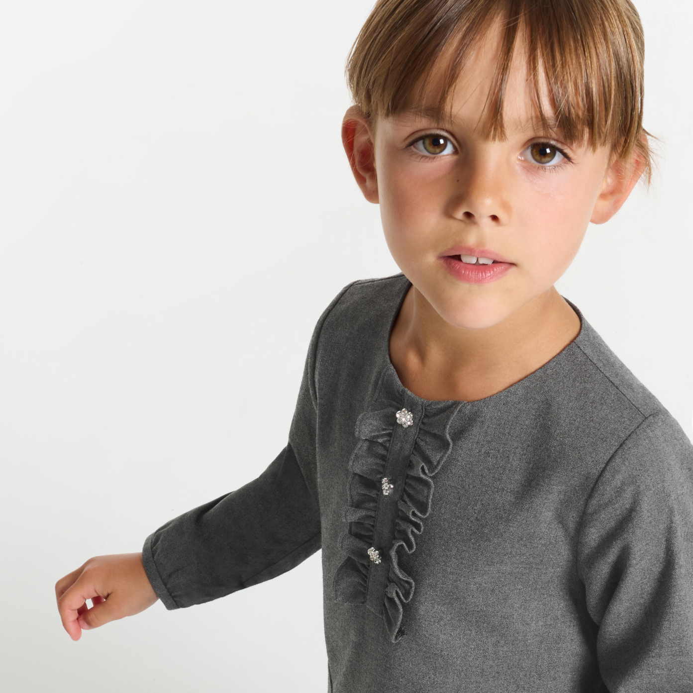 Designed for festive moments and end-of-year celebrations, this girl dress embodies all Jacadi know-how and elegance. Crafted in heather gray flannel and lined in cotton, it features a charming ruffle set with rhinestone flower-shaped buttons. A chic piece to match with tights and patent babies.- Girl flannel dress- Cotton lining- Top adorned with rhinestone flower buttons- Invisible zip opening at back