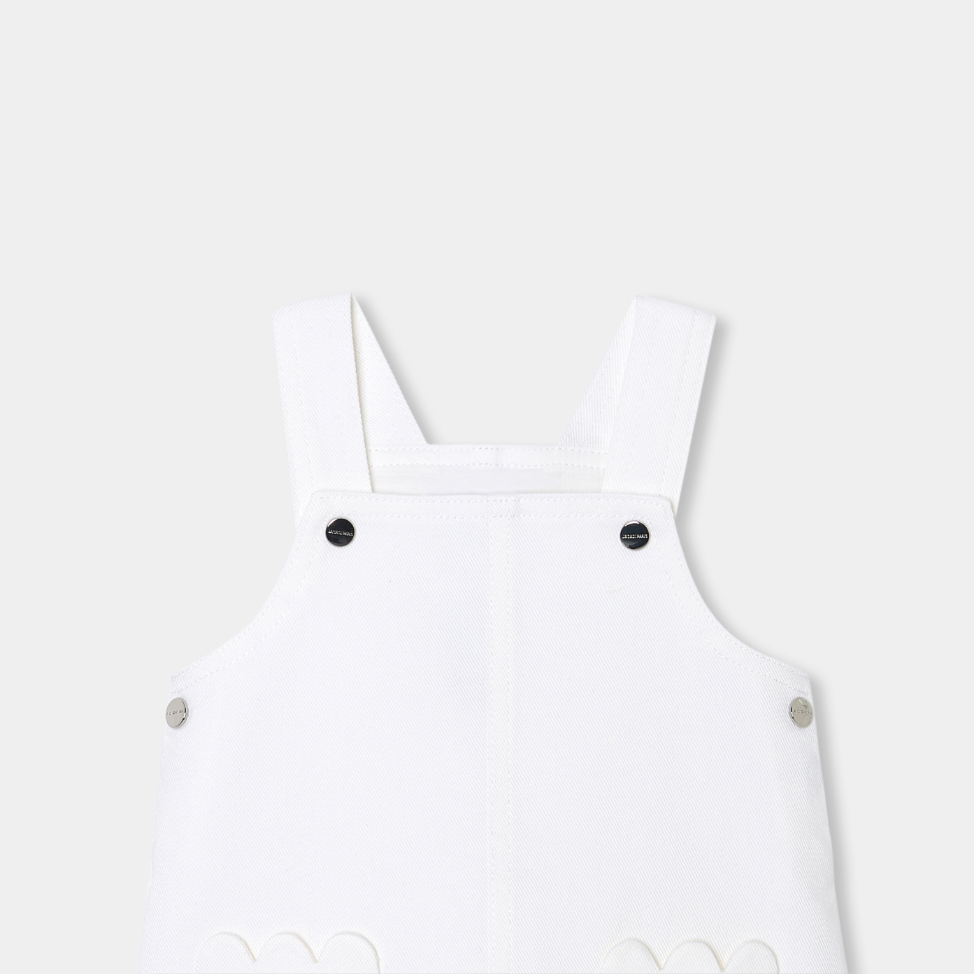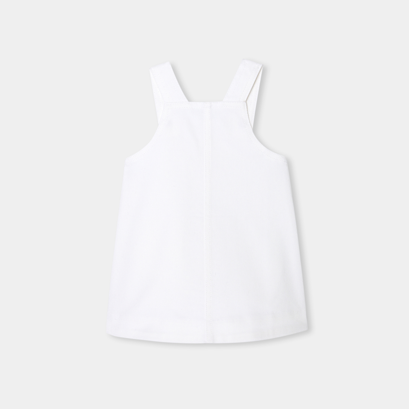 A 60's breeze blows through the little girl's wardrobe with this pinafore baby girl dress. A trapeze cut, accessorised with dungaree-style straps, match this denim-style canvas dress with a polka-dot bodysuit and a Varsity-style cardigan for a silhouette with Parisian charm.-Baby girl A-line dress-Organic cotton fabric-Snapped straps-Scalloped patch pockets
