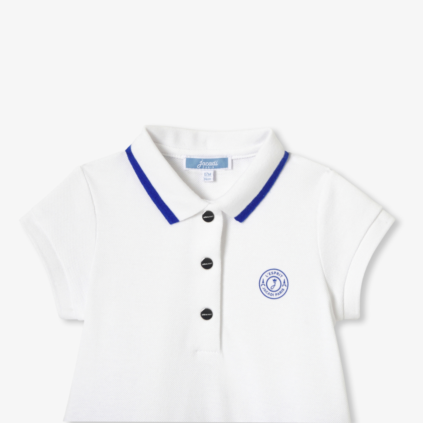 A sporty, chic and geometric season with this baby girl dress. Inspired by the tennis dress with its polo-style top and contrasting pleated skirt. This colour block cotton piqué dress, to be worn with trainers or sandals, will accompany your little one's daily routine until the end of summer.-Organic cotton piqué baby girl dress-Striped polo neck-Press studs placket at neckline-Contrasted pleated skirt-Logo on plastron