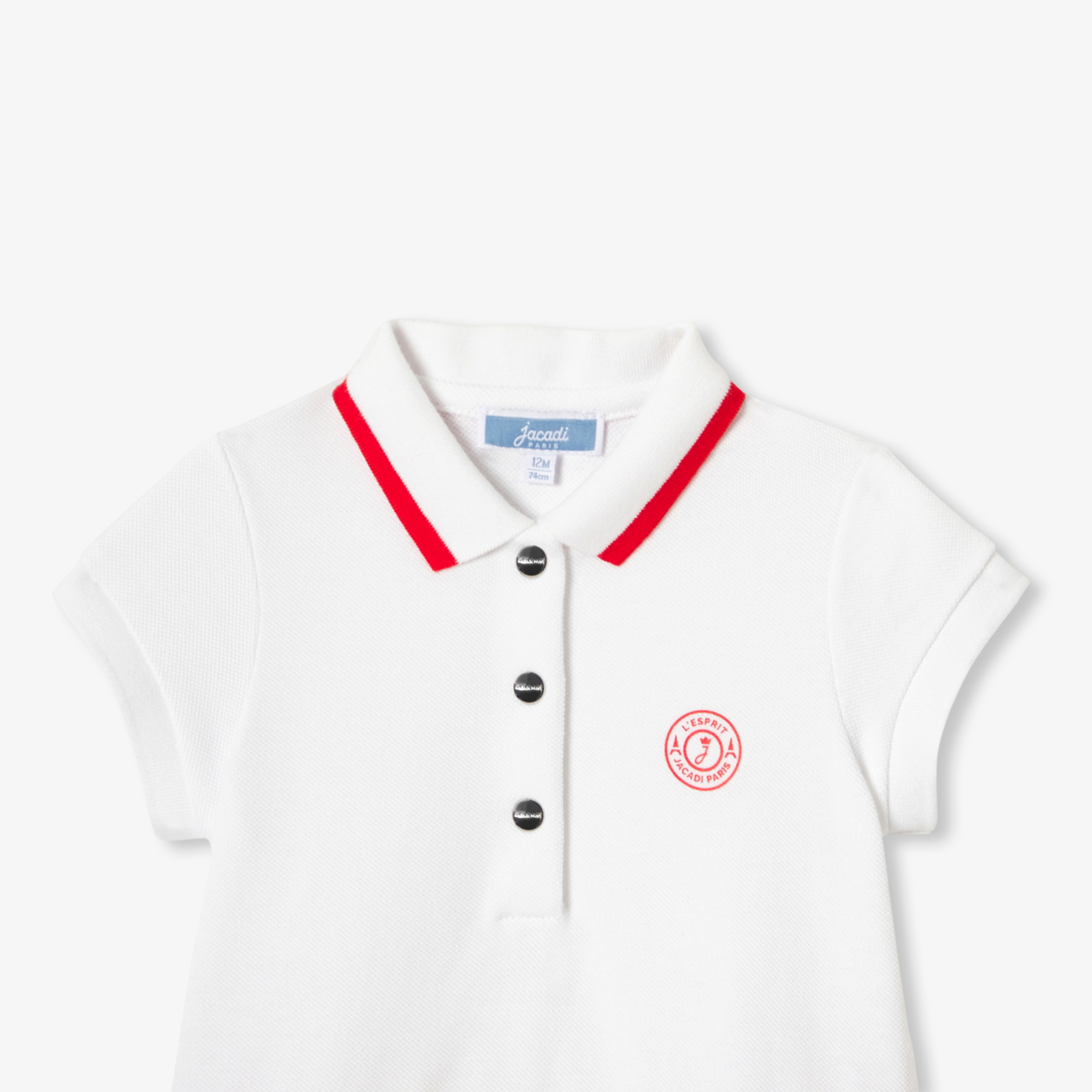 A sporty, chic and geometric season with this baby girl dress. Inspired by the tennis dress with its polo-style top and contrasting pleated skirt. This colour block cotton piqué dress, to be worn with trainers or sandals, will accompany your little one's daily routine until the end of summer.-Organic cotton piqué baby girl dress-Striped polo neck-Press studs placket at neckline-Contrasted pleated skirt-Logo on plastron