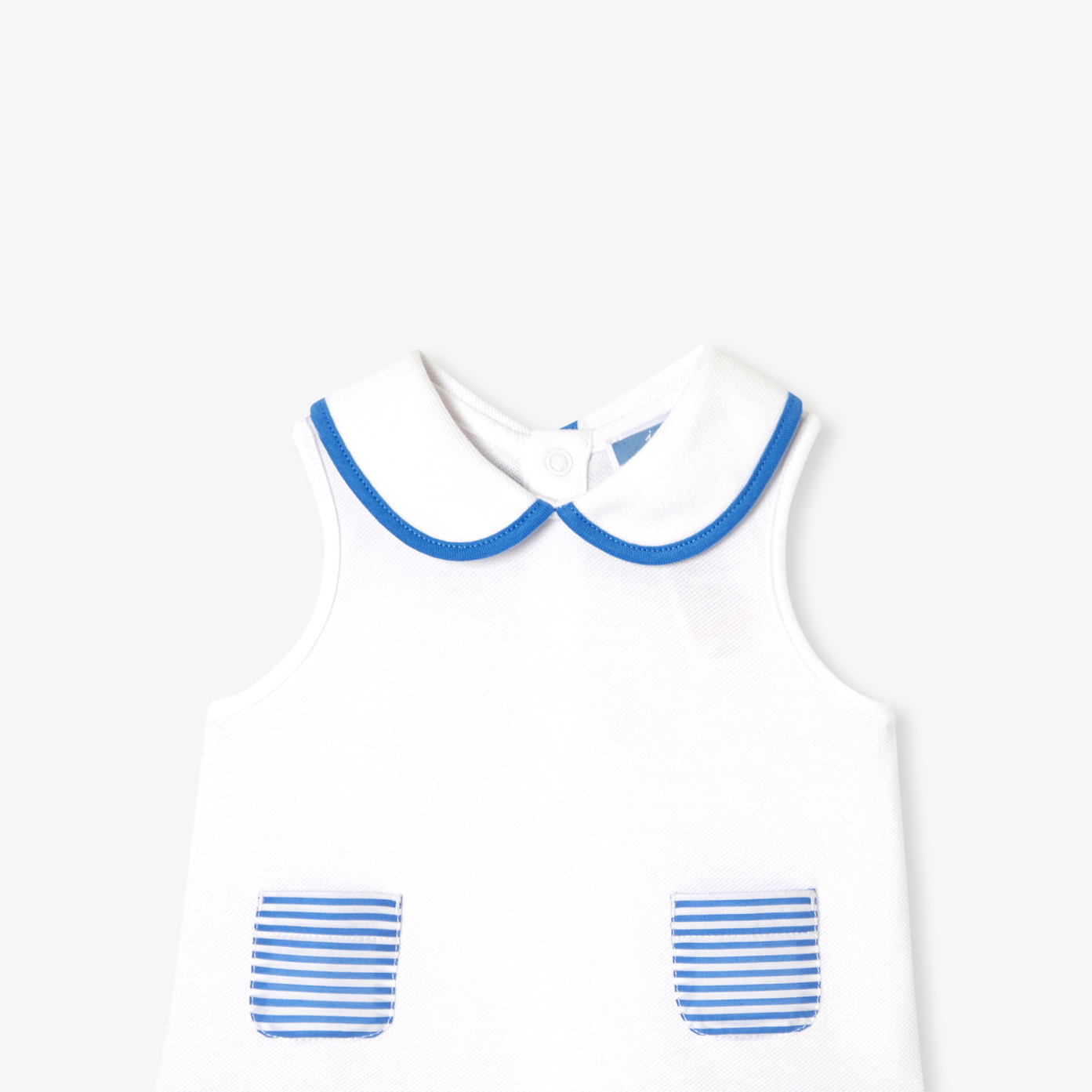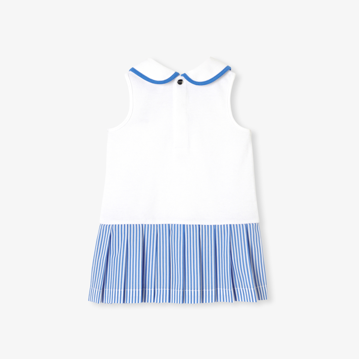 Jacadi has created the perfect dress for midsummer. Retro chic and easygoing, it features a cotton piqué top and a pleated striped skirt. Enhanced by a bias Peter Pan collar and patch pockets, slip this model into the suitcase for vacation.-Sleeveless baby girl dress-Cotton piqué top-Peter Pan collar with contrasted bias-Patch pockets-Striped pleated skirt-Buttoned back opening
