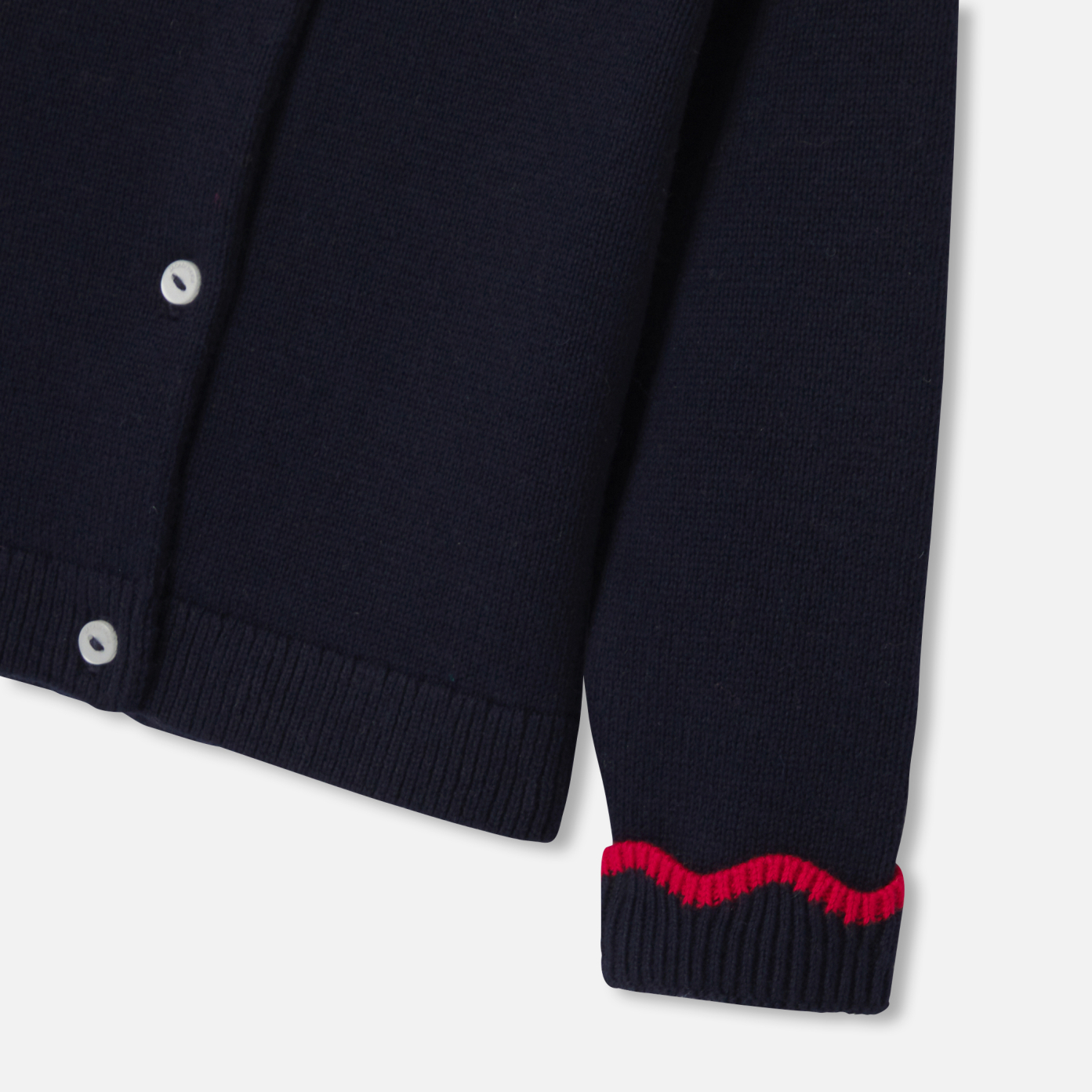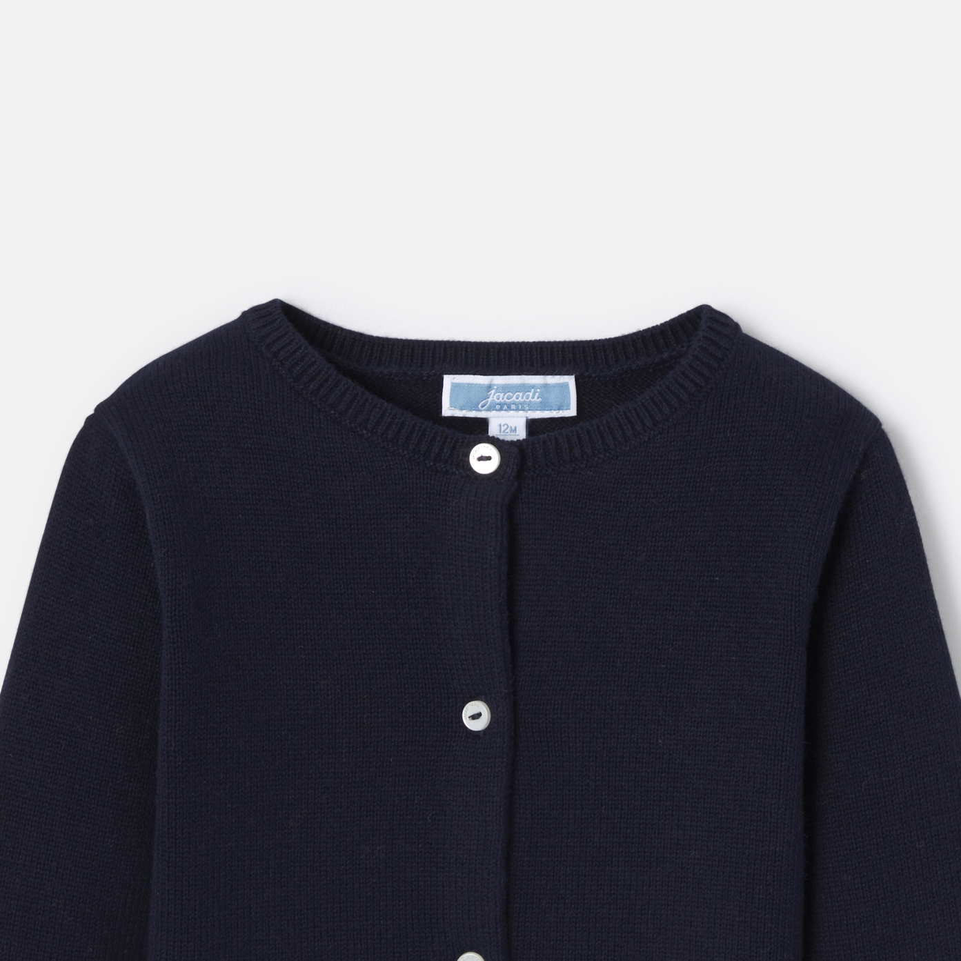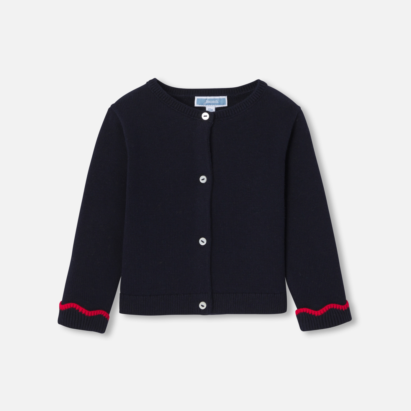 Ideal for warming up any outfit, this baby girl cardigan is available in organic cotton and sustainable wool. In jersey, pretty contrasting scallops at the bottom of the sleeves enhance this all-purpose model, which is easy to match with jeans or a dress. - Organic cotton and sustainable wool - Jersey-stitch knit - Scalloped bottom of sleeves - Button fastening