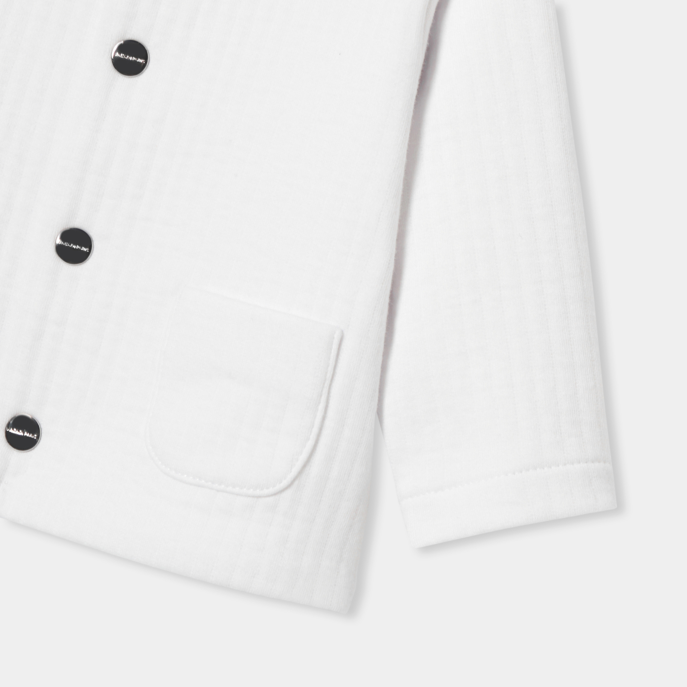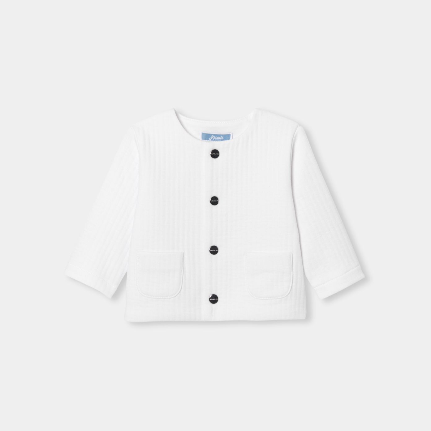 This baby cardigan with its minimalist elegance will find its place in baby's first wardrobe. In soft, fluffy quilted jersey and easy to slip on thanks to its signature snaps, this essential, to be coordinated with a bodysuit and soft denim trousers, will finalise your newborn's everyday outfits.-Organic cotton cardigan-Quilted jersey-Plated round pockets-Snap closure-Baby gift idea