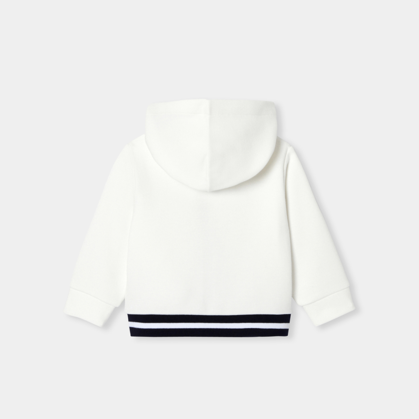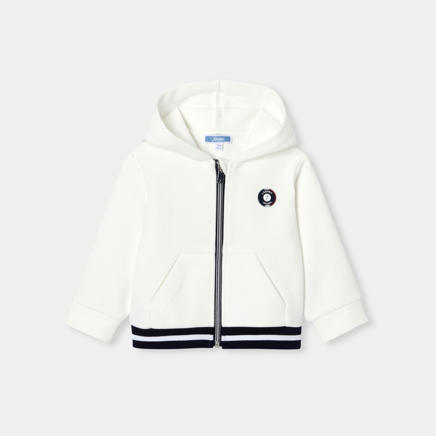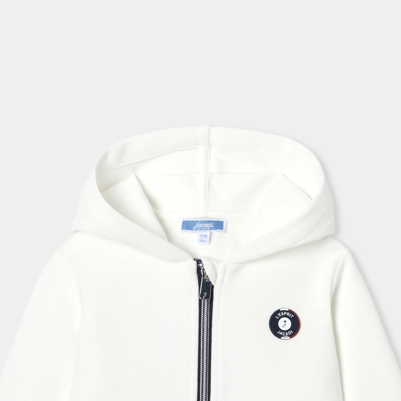 The little ones' wardrobe is enriched by casual pieces that are both sporty and cosy, like this baby zip-up sweatshirt. In soft, supple cotton pique, patch pockets, ribbed hem and Jacadi badge complete this everyday essential, which can be paired with matching joggers for spring.-Zipped baby sweatshirt in pique-Hood-Patch pockets-Base in striped ribbed hem-Zip fastening-Badge Jacadi on front panel