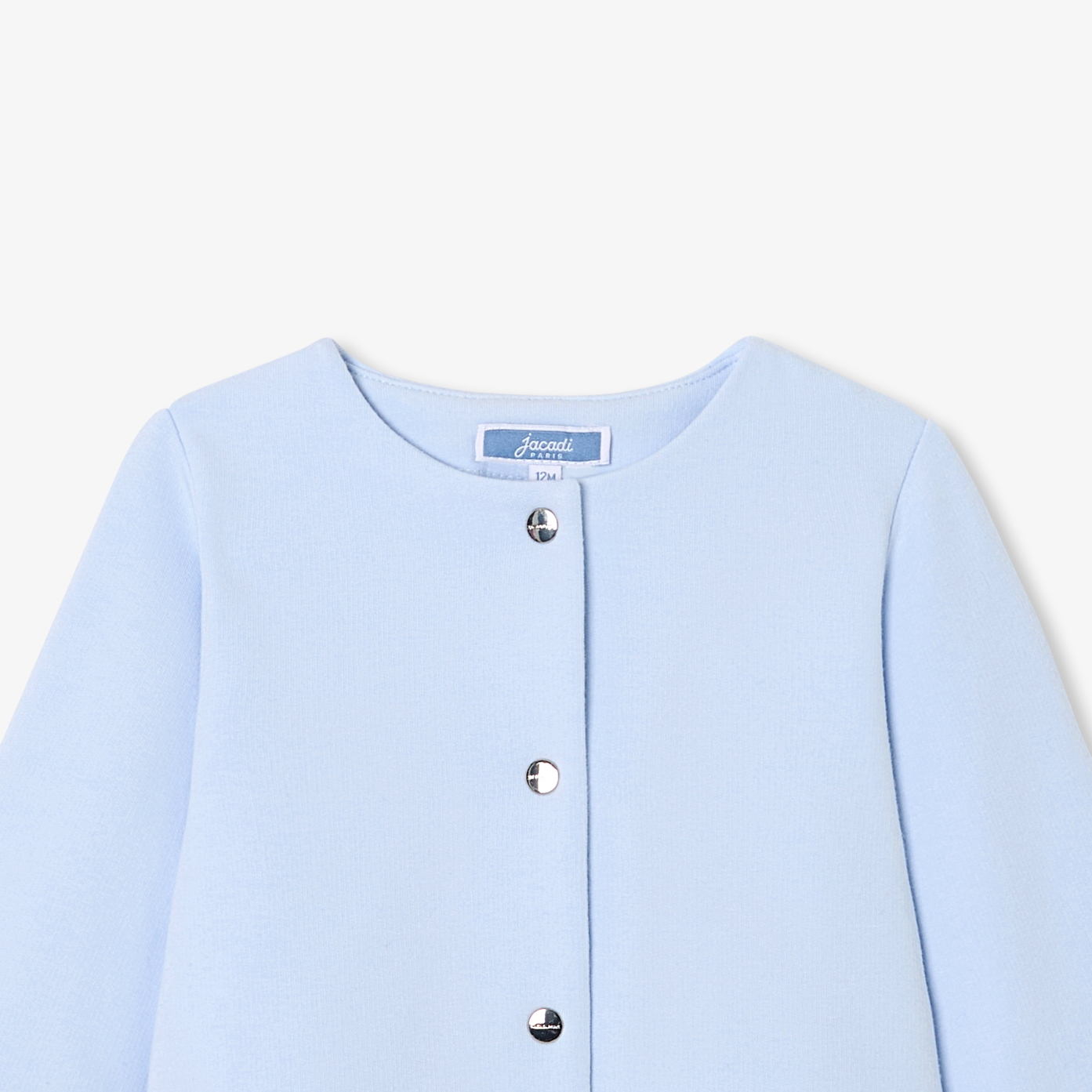 A fleece wardrobe essential, this baby girl cardigan opts for a sleek, geometric cut. Scalloped at the base and easy to slip on, it will warm up dresses and bloomers this spring.-Baby girl organic cotton cardigan-Scalloped base-Press stud fastening