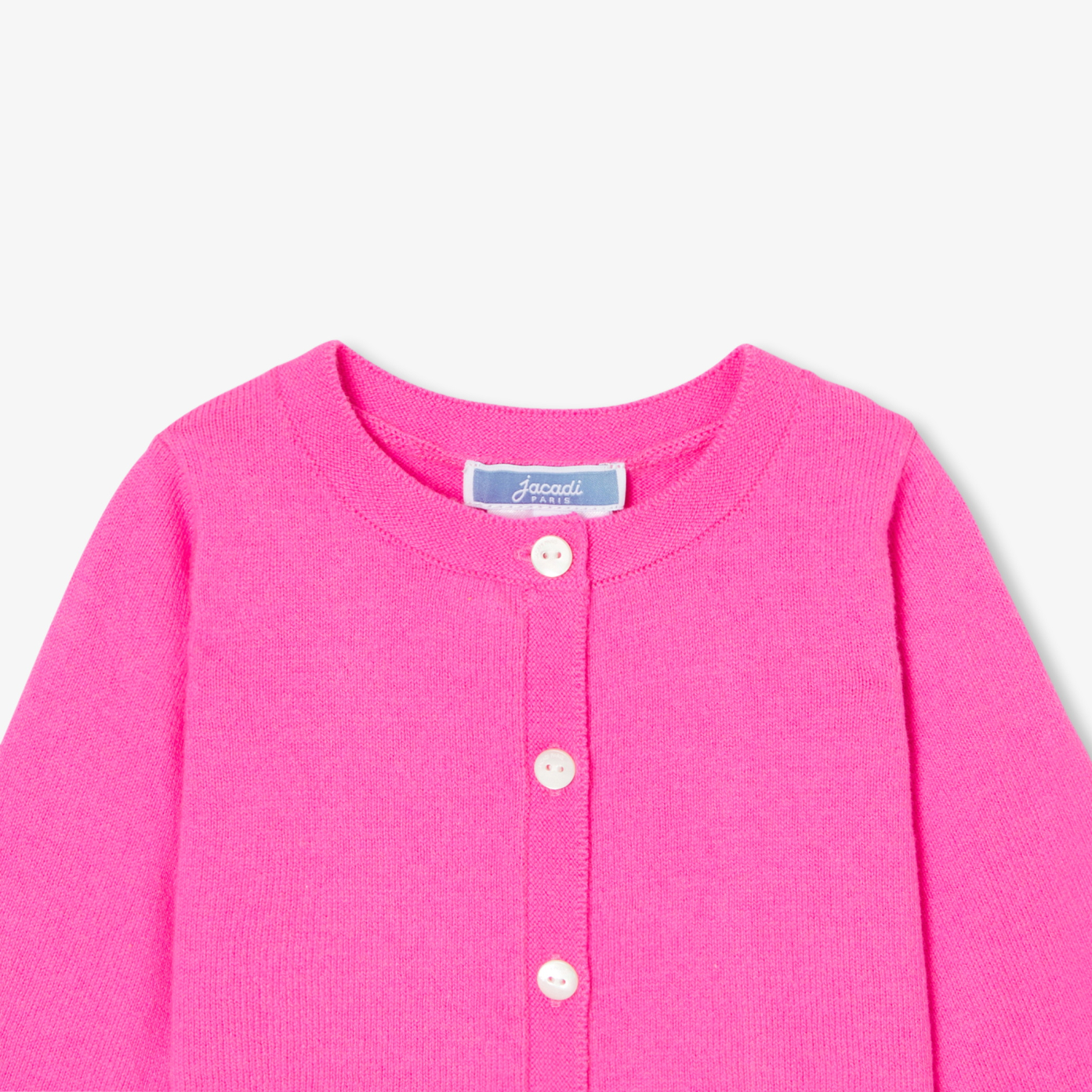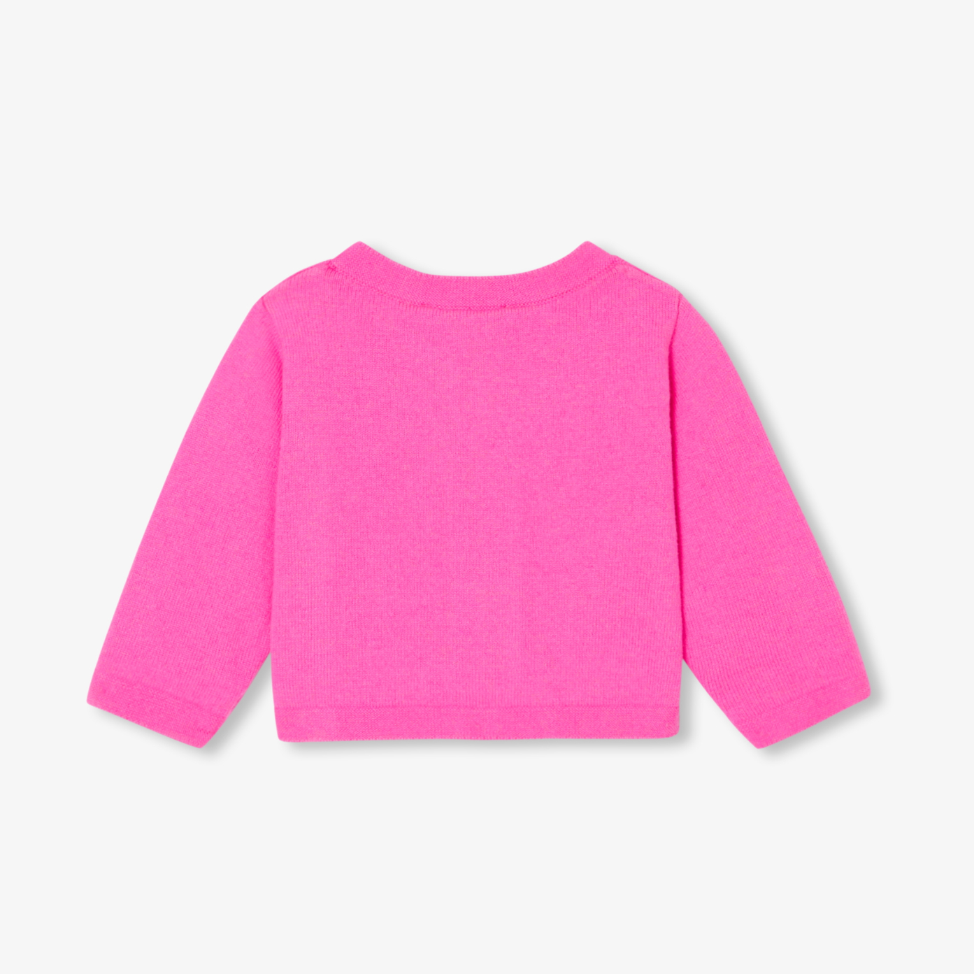 A baby girl cardigan that is easy to wear from spring to fall. Made from ultra-comfortable organic cotton jersey, its pop-pink colour is the perfect match for a Liberty fabric dress or a romper to complete a formal outfit.-Organic cotton baby girl cardigan-Ouverture with natural mother-of-pearl buttons