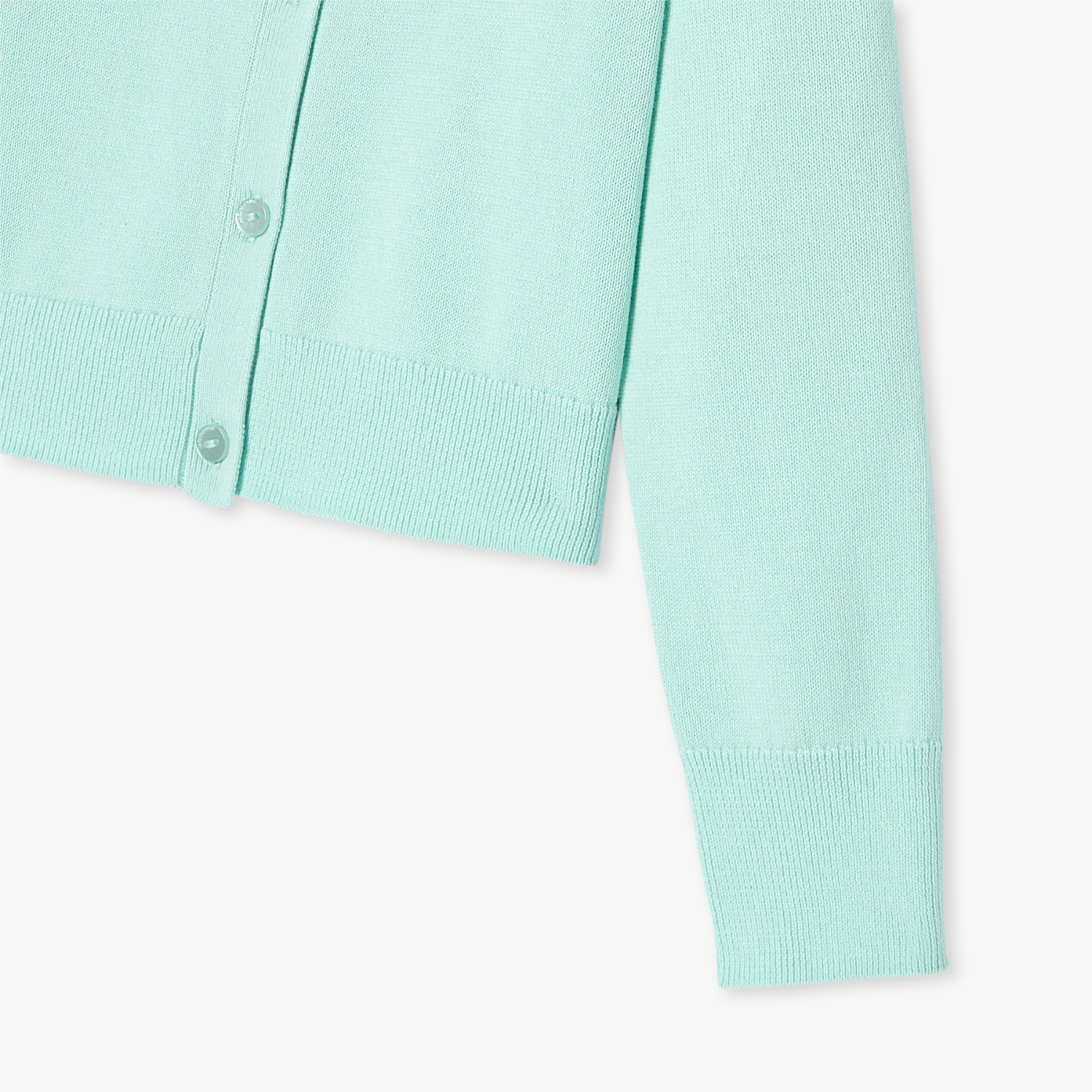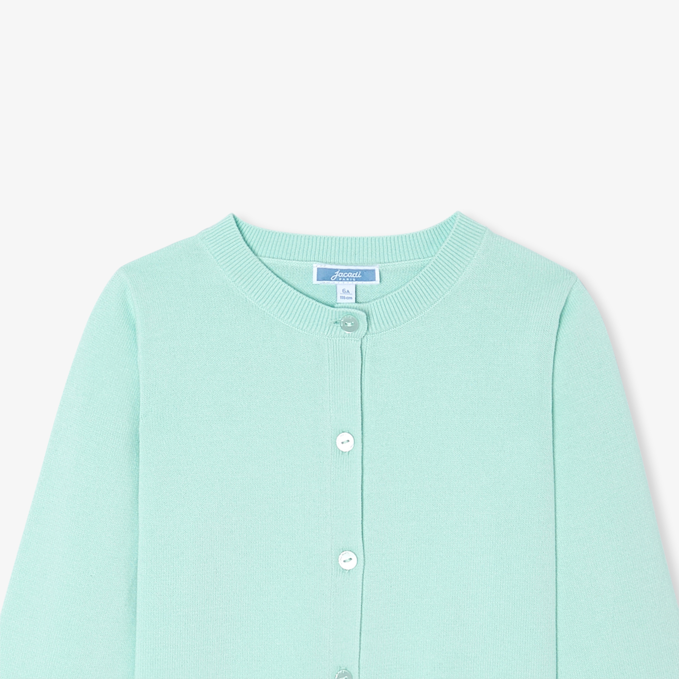Pastel colours for this girl cardigan for spring. Water blue or sky blue, this minimalist model can be worn over a t-shirt or blouse with wide-leg trousers for a romantic folk silhouette.- Girl cardigan in organic cotton- Jersey knit- Mother-of-pearl button opening- Ribbed trim