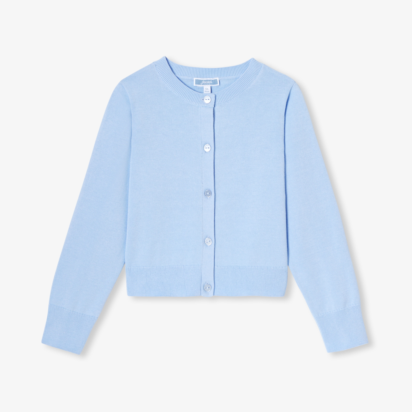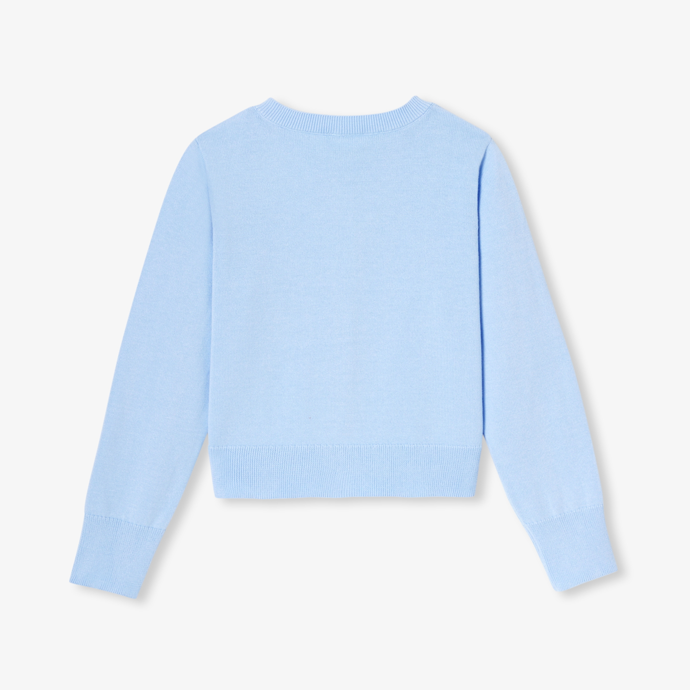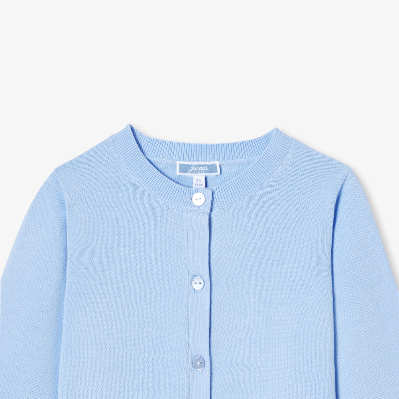 Pastel colours for this girl cardigan for spring. Water blue or sky blue, this minimalist model can be worn over a t-shirt or blouse with wide-leg trousers for a romantic folk silhouette.- Girl cardigan in organic cotton- Jersey knit- Mother-of-pearl button opening- Ribbed trim