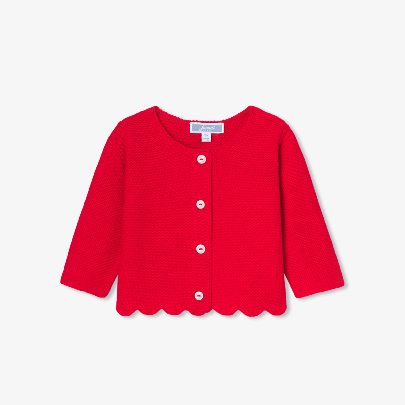 A must-have for the new-season wardrobe, this baby girl cardigan is available in soft, supple cotton. Knitted in garter stitch, with a scalloped base and natural mother-of-pearl buttons, this model is perfect for everyday wear. Worn over a blouse or dungarees, its soft pink hue will complement Jacadi's collection.- Baby girl organic cotton cardigan- Soft, supple garter stitch knit- Scalloped base- Natural mother-of-pearl button opening.