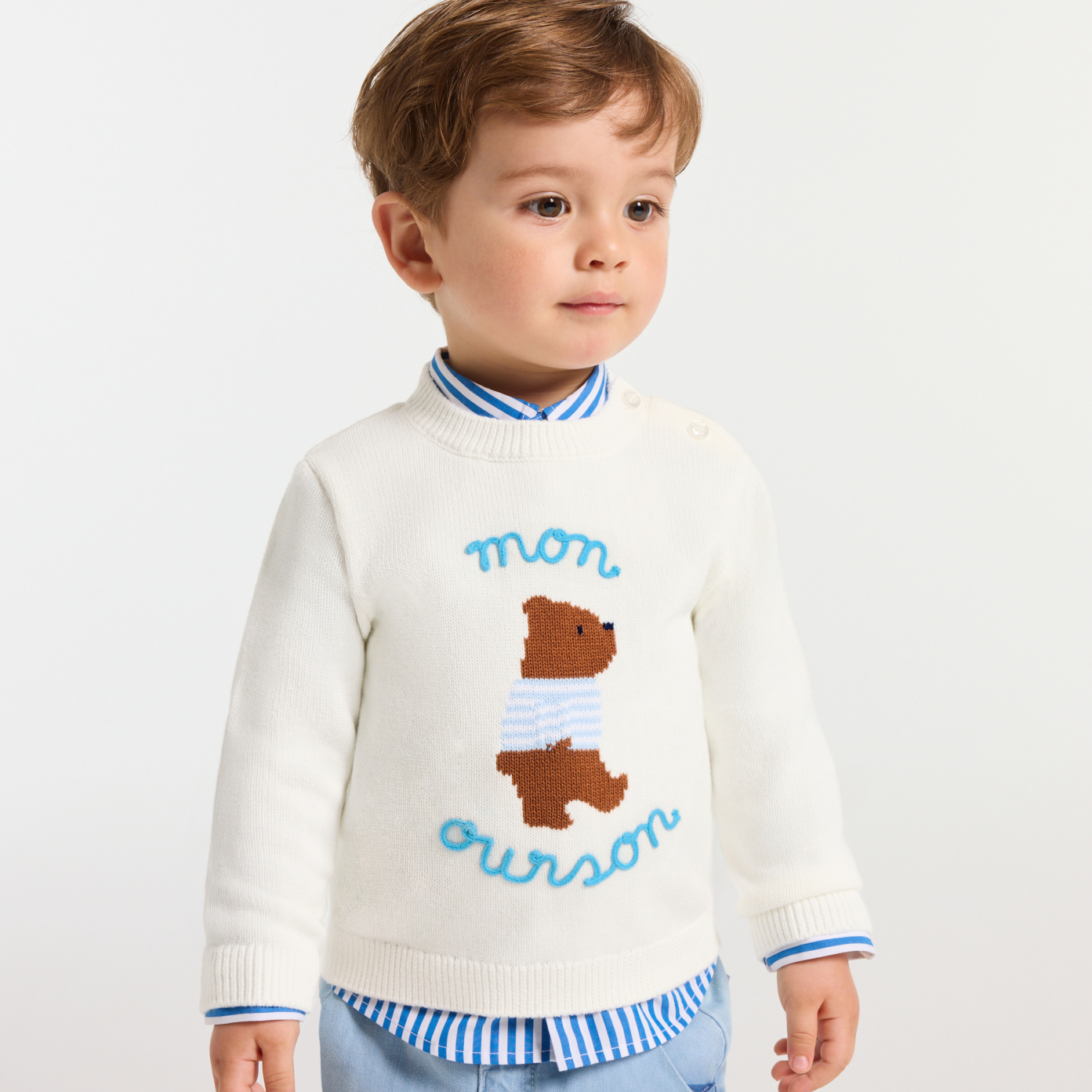 The softness of cotton, the tenderness of a teddy bear motif, fall for this season baby boy sweater with its cosy, playful design. Easy to slip on and comfortable, this model, ideal for the start of the season, will quickly become a favorite.- Baby boy jumper in organic cotton- Intarsia teddy bear and message- Button placket on shoulder