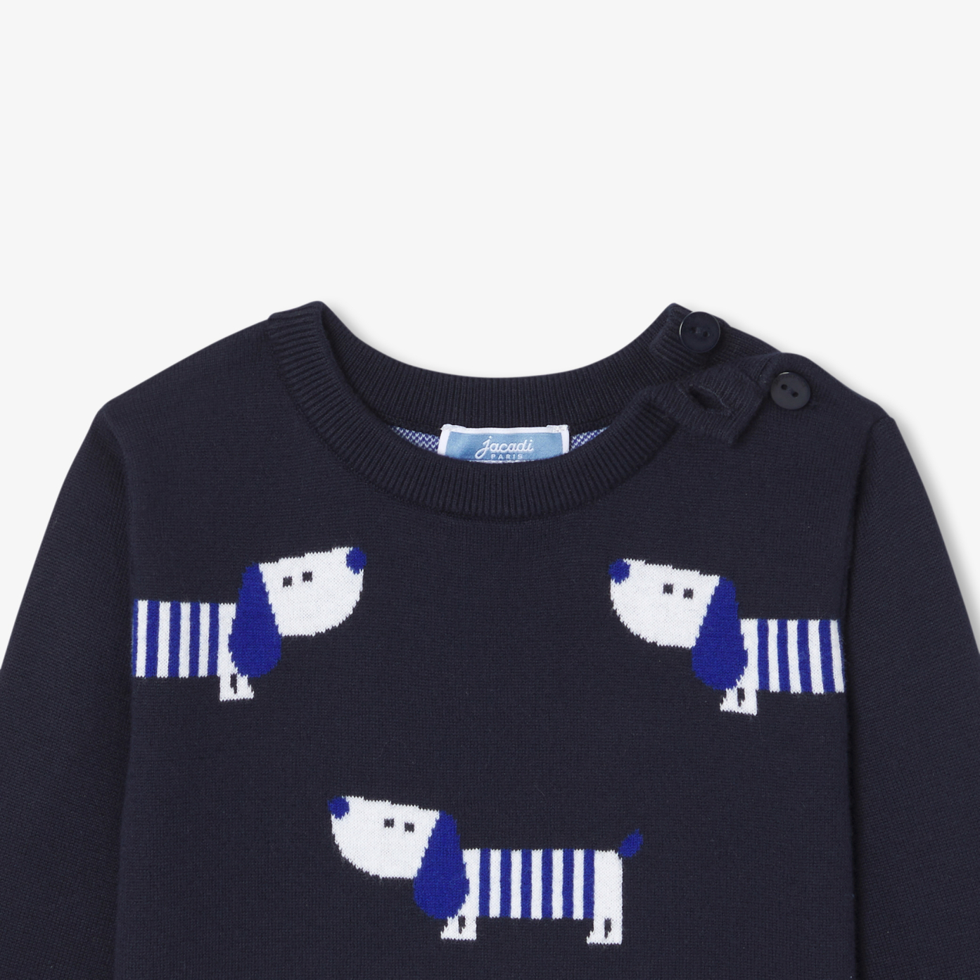 A classic in the early-season wardrobe, this baby boy cotton sweater is enlivened by little dogs in Breton tee for the occasion. Made from soft, supple double-sided knit, it opens at the shoulder with a button placket. Paired with rolled-up jeans and ankle boots for a chic, Parisian casual silhouette, this playful model is perfect for composing everyday outfits.- Baby boy cotton sweater- Soft, supple double-sided knit- Jacquard dog in sailor tee- Button placket on shoulder