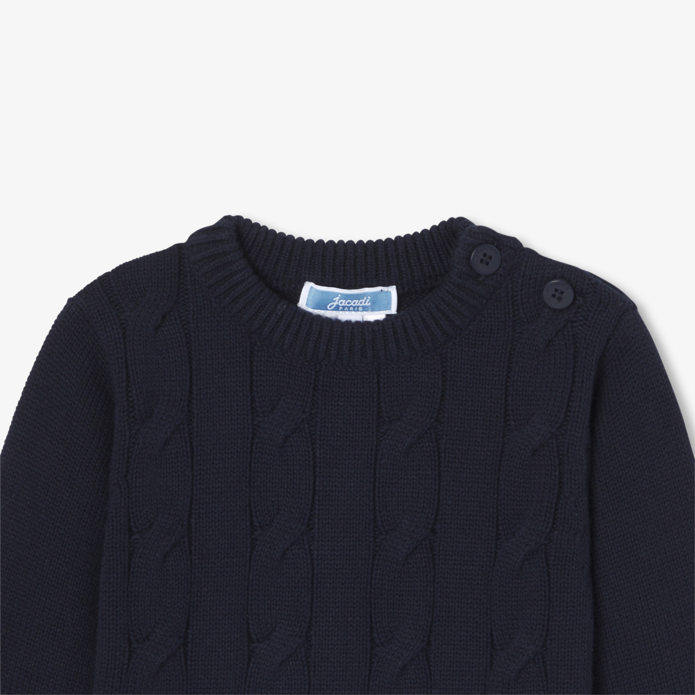 Mixing preppy elegance with contemporary detailing, this baby boy sweater stands out from the crowd with its twisted knit and striped ribbed base. In soft cotton and easy to slip on thanks to its button placket, velvet trousers and jeans will go perfectly with this autumn wardrobe essential.- Organic cotton baby boy sweater- Twisted knit- Thick gauge- Button placket at shoulder- Striped base
