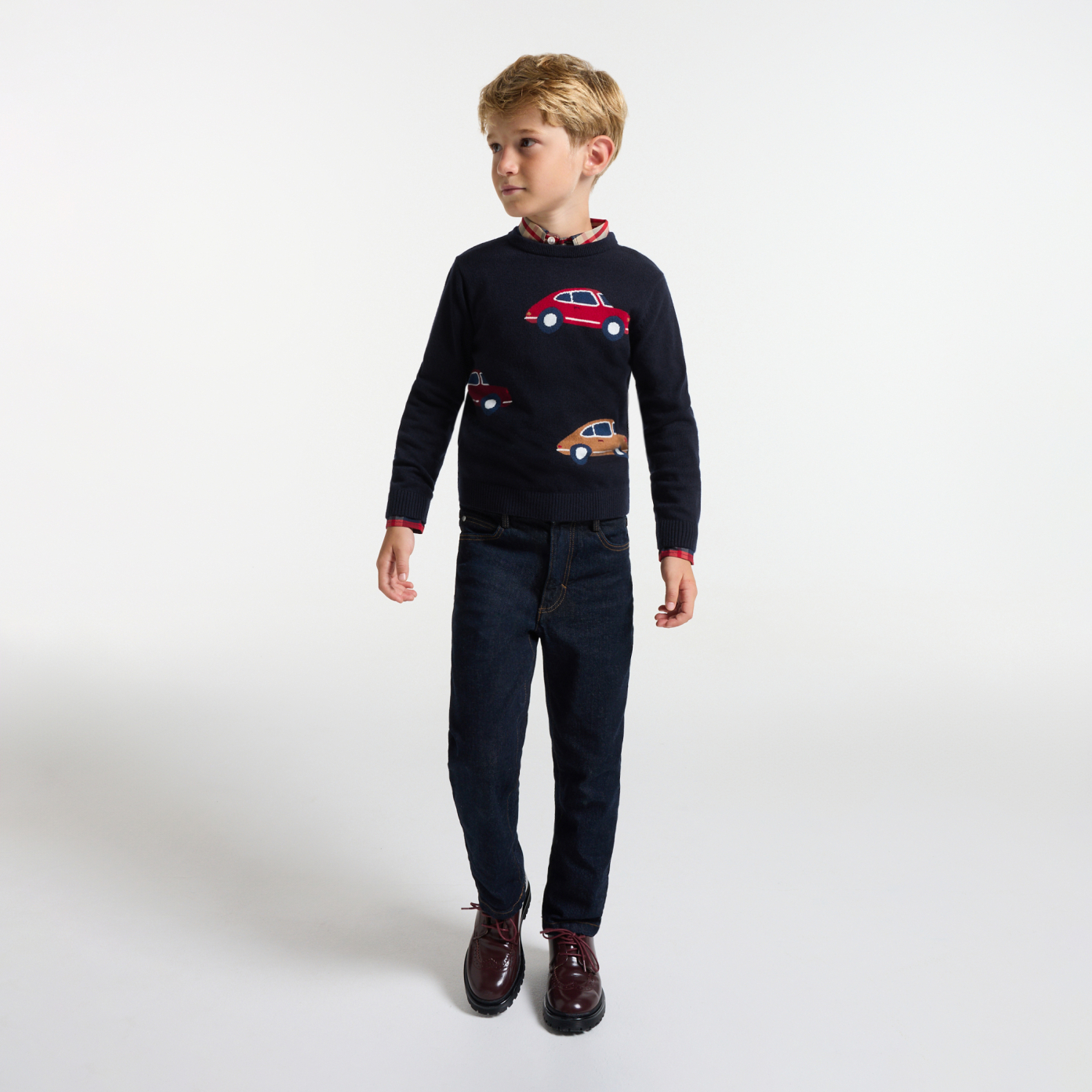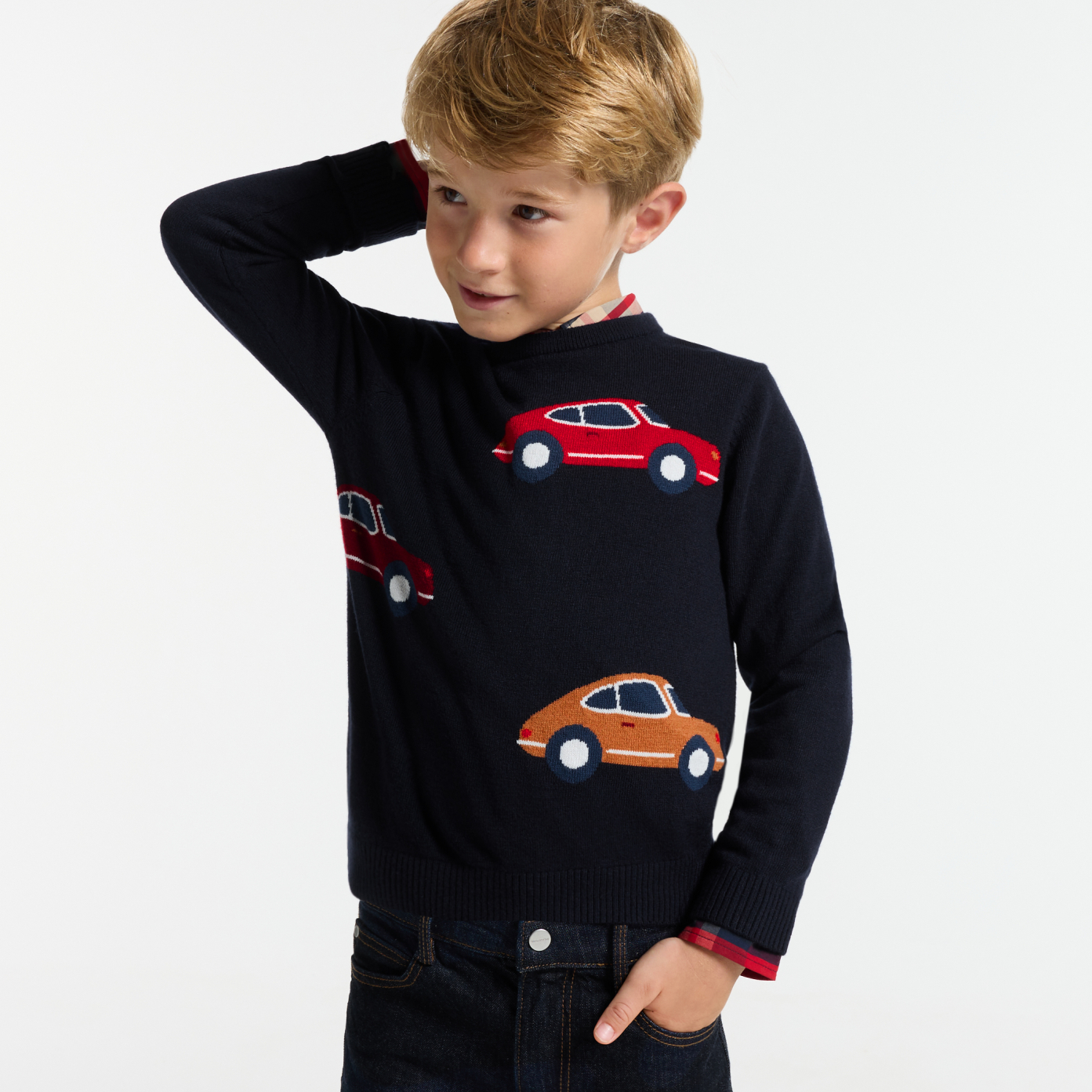 For all racing car fans, Jacadi has created the sweater boys have been waiting for. In soft, supple wool, it is adorned by vintage cars in original colors. Worn with twill pants and desert boots for a casual chic silhouette, your boy will love it.- Responsible wool Boys sweater- Soft, warm knit- Intarsia cars