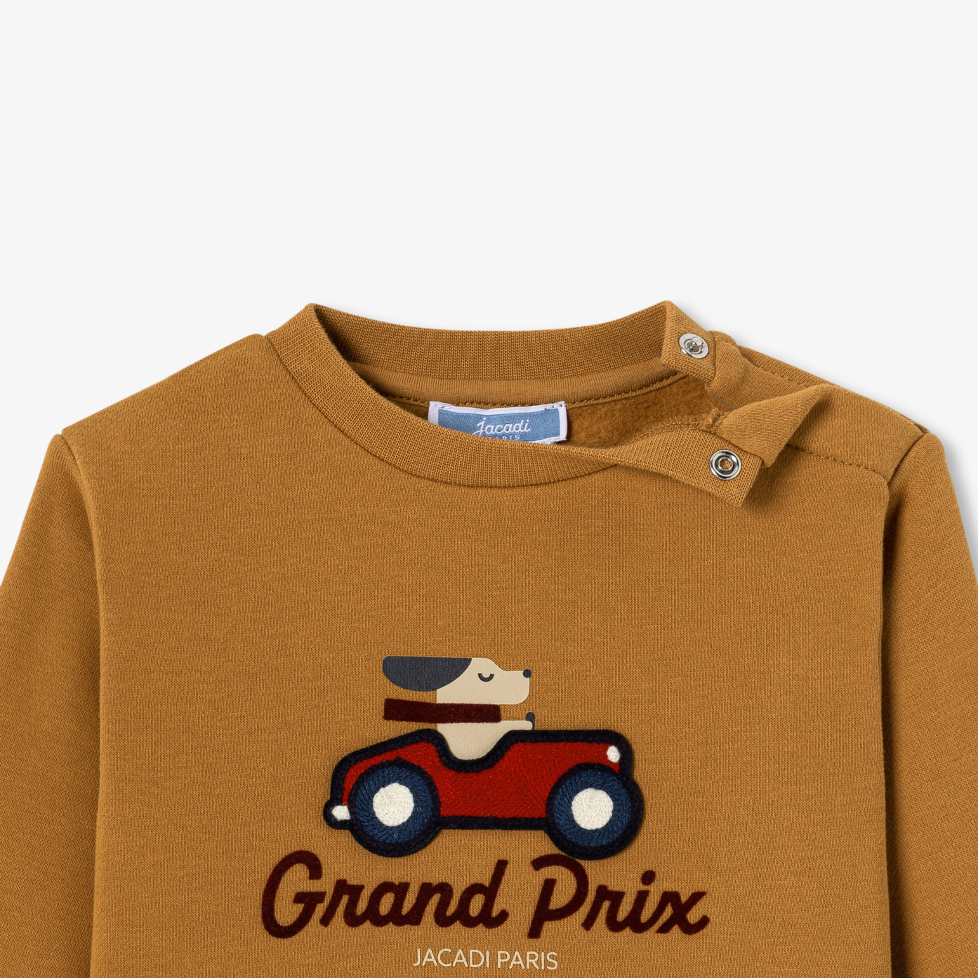 This autumn, the baby boy sweatshirt takes a trip to the heart of the capital aboard a vintage car. Made from bonded fleece with a soft velvet lining, this seasonal must-have is perfect for wearing with jeans or velvet trousers, and is sure to please racing-car fans.- Baby boy sweatshirt in bonded fleece and organic cotton- Soft velvet interior- Shoulder snap opening- Playful pattern on front- Ribbed trim
