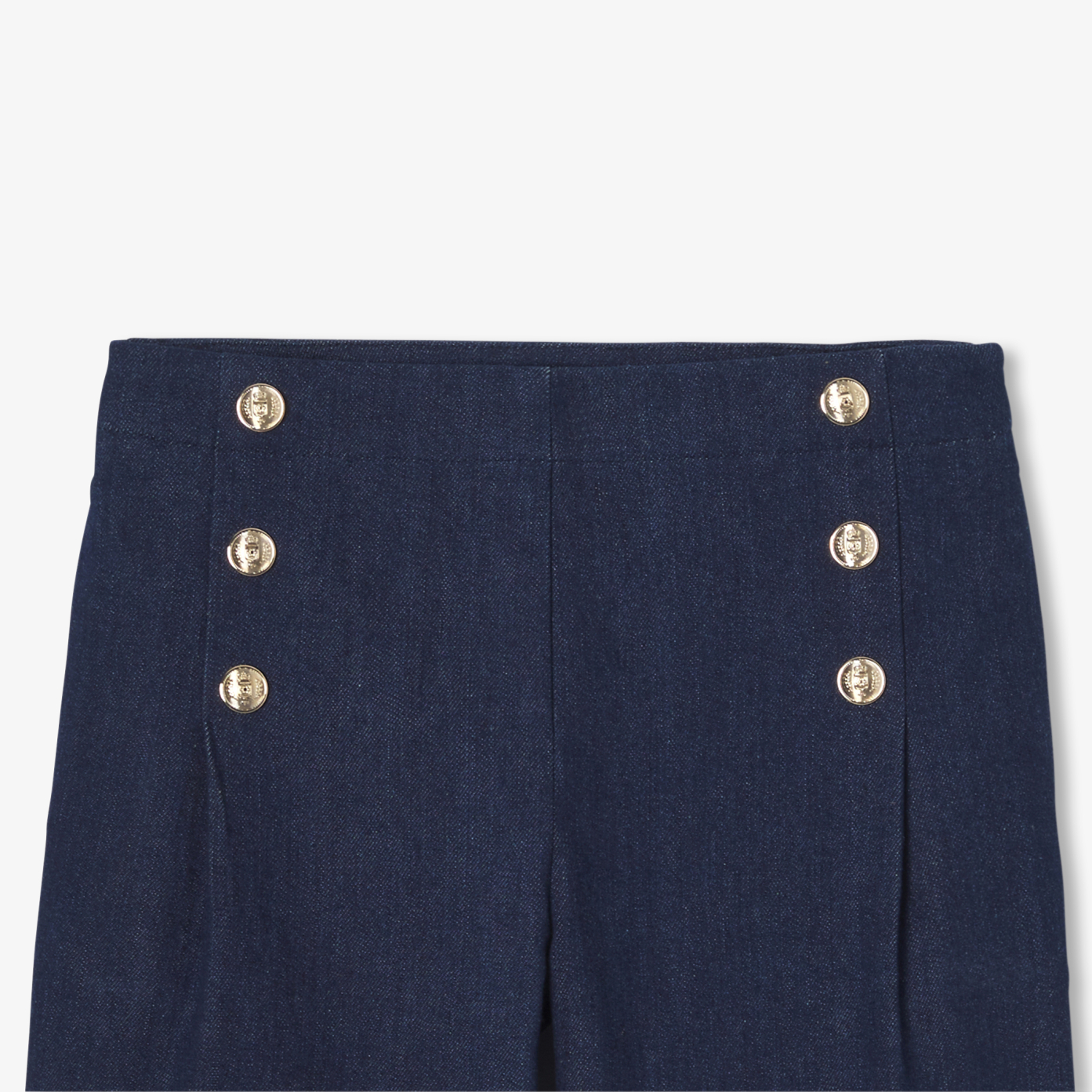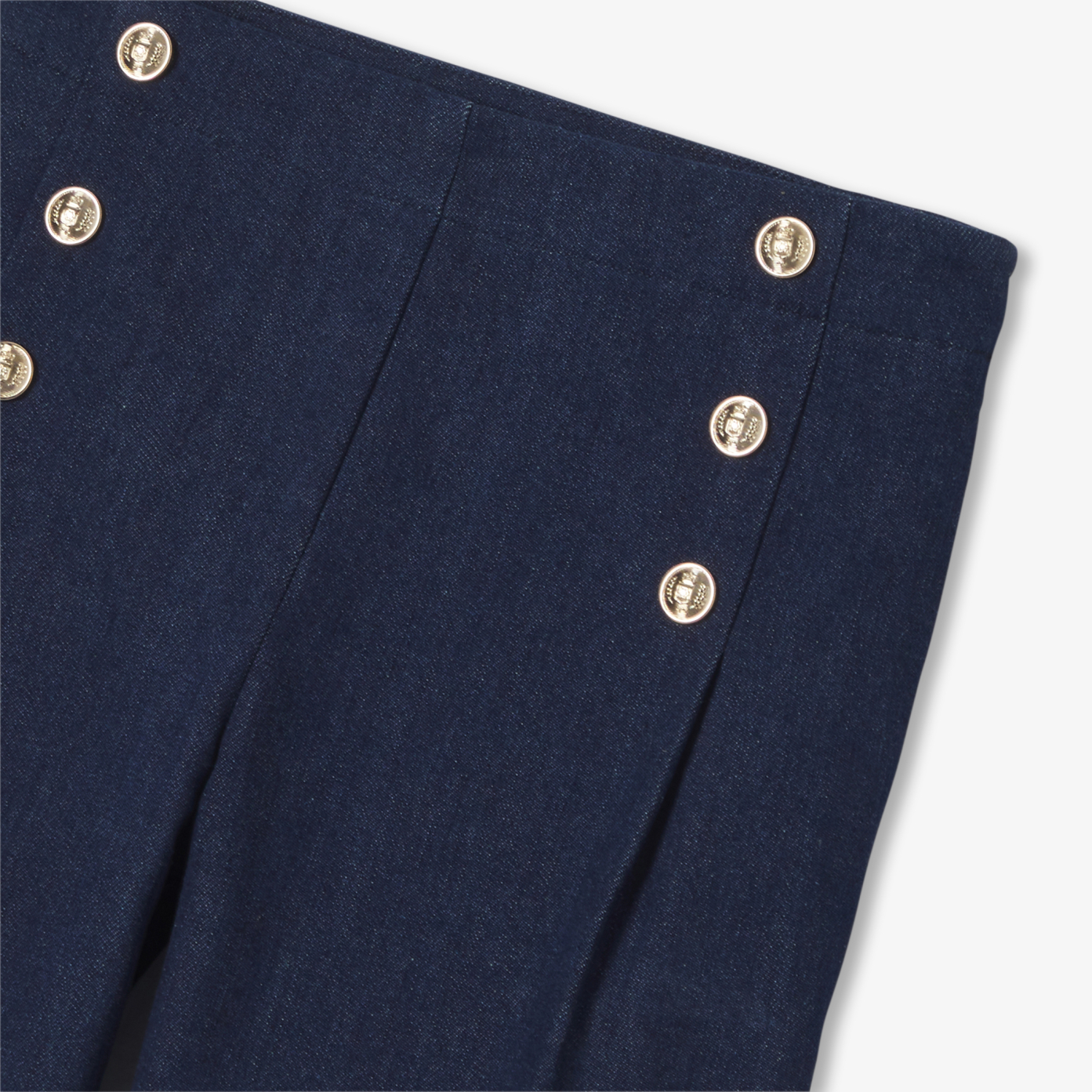 As chic as they are essential, our girl jeans are cut wide and in raw blue for a preppy chic silhouette. Inspired by tab trousers with their gold buttoning, these versatile trousers to be worn with a t-shirt and matching jacket are to be slipped into the back-to-school wardrobe without further delay.- Girl wide-leg jeans- Raw denim- Tab-style gold buttoning- Pleats on legs- Invisible zip and side press stud opening- Elastic waistband adjustment