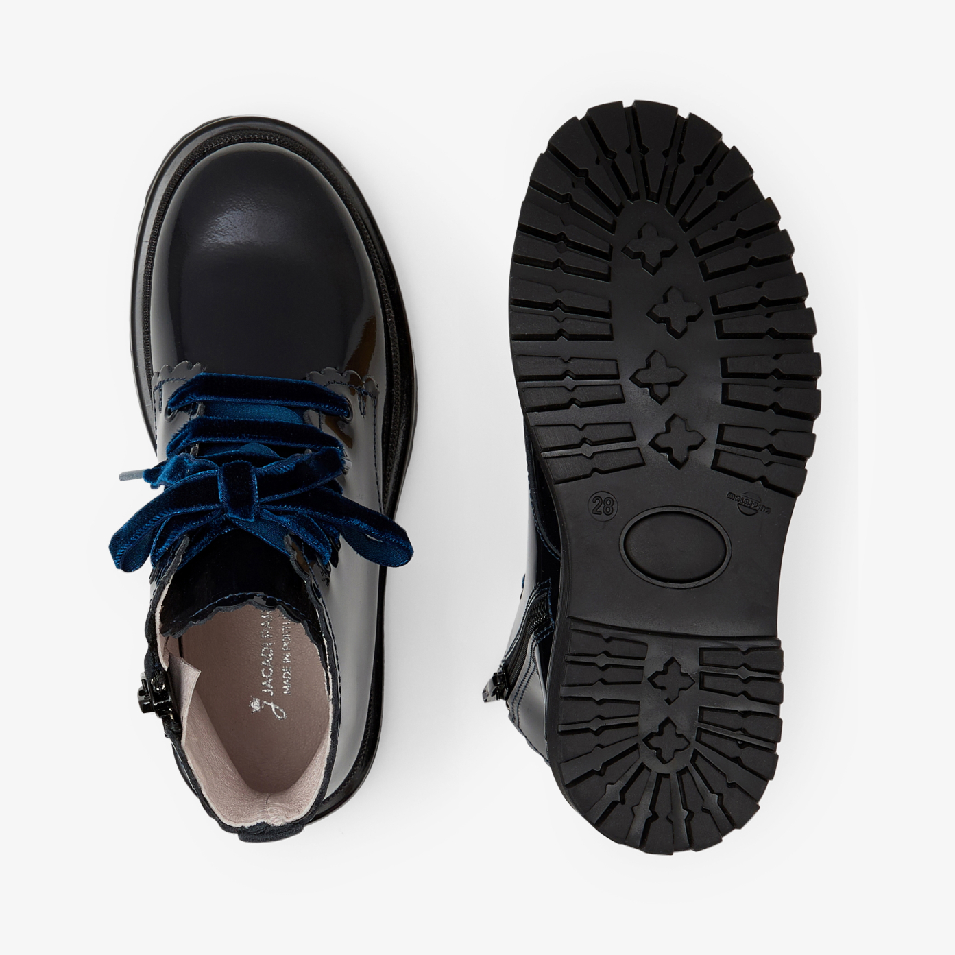 Modern aesthetics and an assertive look for our girl ankle boots. Available in patent leather, with a notched sole, scalloped upper and tonal velvet laces, these shoes are easy to slip on thanks to their side zipper. Wear them with a pleated skirt or wide-leg trousers for a preppy look, and they will be a welcome addition to your back-to-school wardrobe.- Made in Portugal- Patent leather- Leather lining- Removable insole- Velvet laces- Zipper closure- This model fits wide.