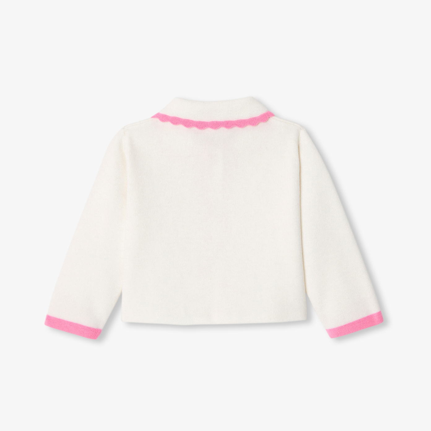 A classic reinterpreted in a retro chic version, Peter Pan collar and contrasting scalloped details punctuate this delightful baby girl cardigan. In sustainable wool and cashmere, worn closed over a collarless t-shirt with velvet trousers, this essential will add flair to any winter silhouette.- Sustainable wool and cashmere baby girl cardigan- Peter Pan collar- Buttoned opening- Contrast scalloped trim
