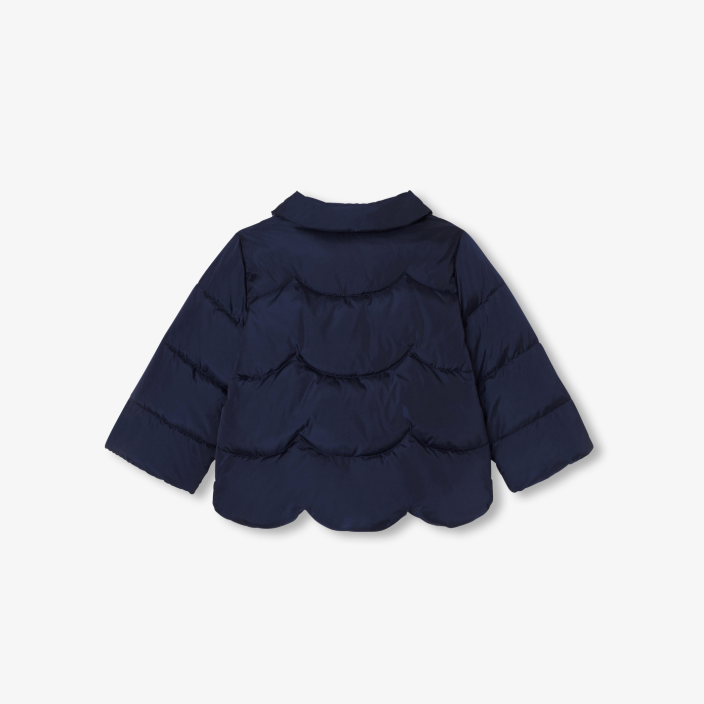 As full-coverage and slimmer as ever, our designers have reworked the cut of this baby girl padded jacket to create an ultra-contemporary piece. Water-repellent and easy to put on thanks to its snap opening, it features a Peter Pan collar and a scalloped base. Worn on strolls and on the way to daycare, it is a wardrobe essential to offer this season.- Thin water-repellent baby girl padded jacket- Recycled polyester filling- Slightly shorter cut- Peter Pan collar- Scalloped base- Snapped openingWater-repellent treatment allows water to slide off the surface of the garment. It protects against light rain, but does not prevent water from passing through in the event of prolonged exposure or heavy rain.