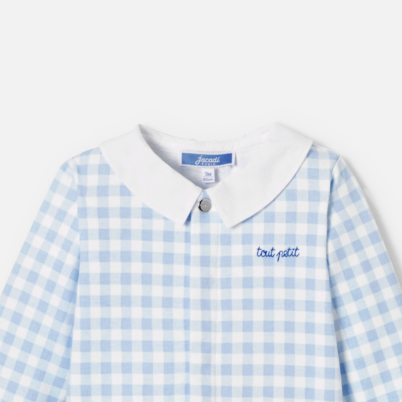 The timeless gingham pattern makes an appearance in the newborn set with these baby boy pyjamas. Made from soft interlock cotton, they are elegantly topped with a white poplin collar and open at the front for easy, secure dressing.- Organic cotton baby boy pyjamas- Gingham print- White poplin collar- Invisible snap front opening - Lovely birth gift idea to offer or to treat yourself to.