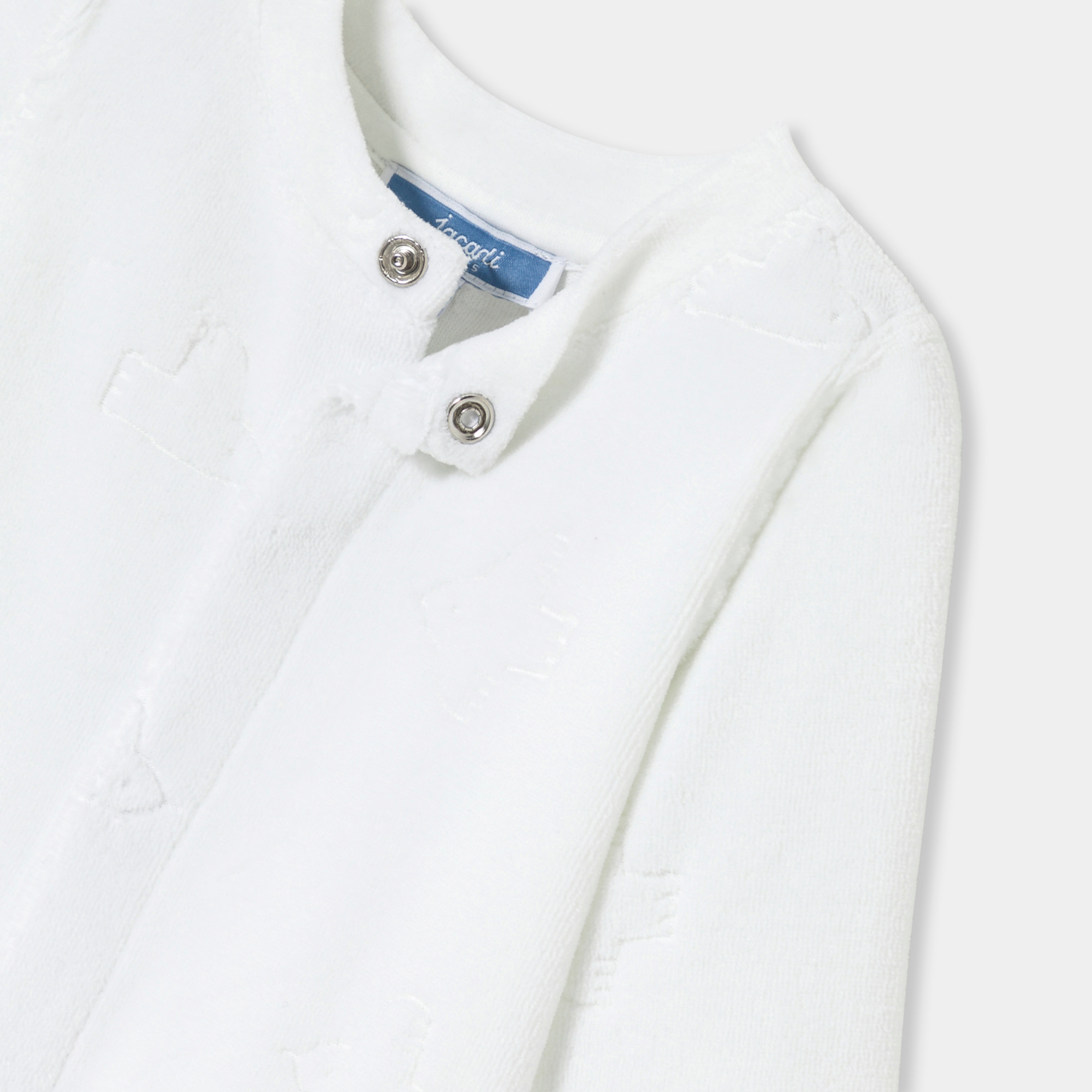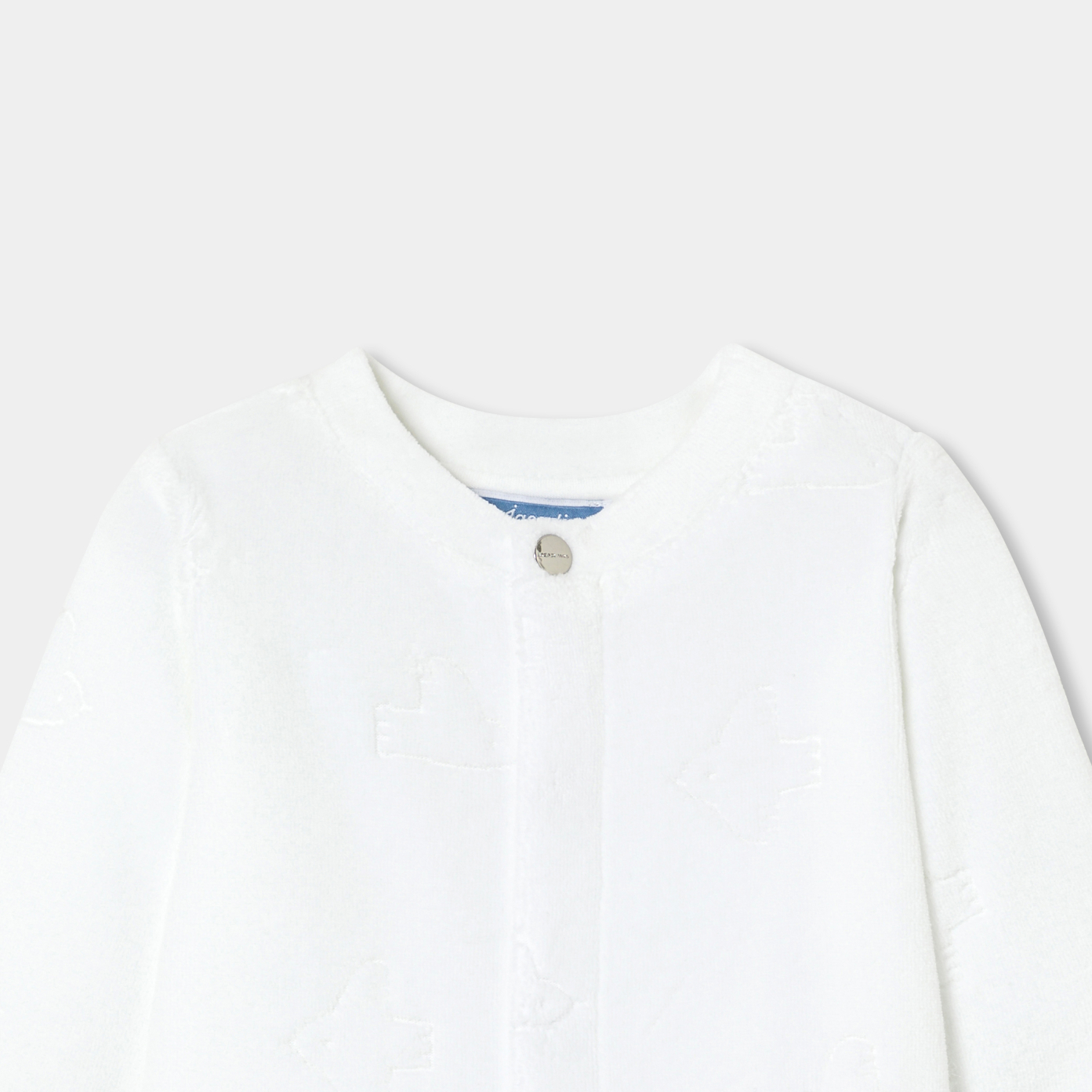 Combining the comfort of soft organic cotton velour with the originality of an enchanting seagulls motif with a devoured effect, these baby pajamas designed to compose the hospital bag will accompany your newborn from the very first days. With its round collar and press stud fastening at the front for easy, secure dressing, this wardrobe essential is a great idea for a baby gift. - Organic cotton baby pajamas - Devoured effect seagulls pattern- Invisible press stud fastening at front