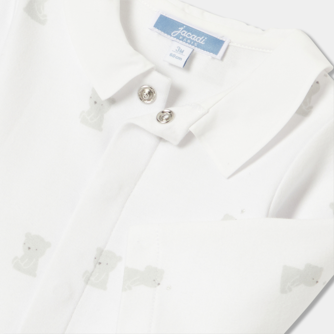 Elegant day and night in baby boy's organic cotton interlock pyjamas. All-over print and featuring an elegant poplin collar, they open at the front with invisible snaps for easy, secure dressing. An everyday essential to slip into your hospital bag, it is perfect for putting together your newborn's first trousseau.-Organic cotton boy sleepwear-Poplin collar-All-over print-Invisible front press studs-Great idea for a baby gift, either for yourself or as a present.