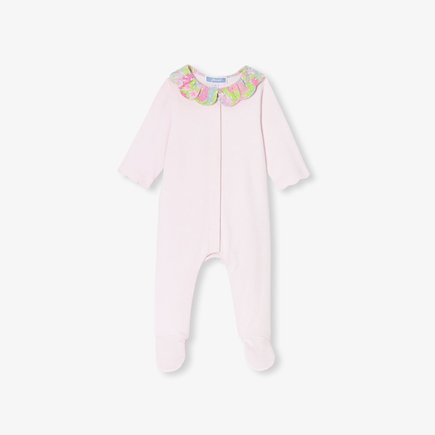 A wardrobe classic with an elegant Liberty scalloped collar, these baby girl pyjamas are ideal for the hospital bag and the first nights of spring. Made from soft, supple organic interlock and easy to slip on thanks to their front opening, their liberty fabric inserts under the feet add extra style to this model.-Organic cotton baby girl sleepsuit-Scalloped collar in poplin-Snap front opening-Alice or Ciara Liberty fabrics in exclusive Jacadi colours