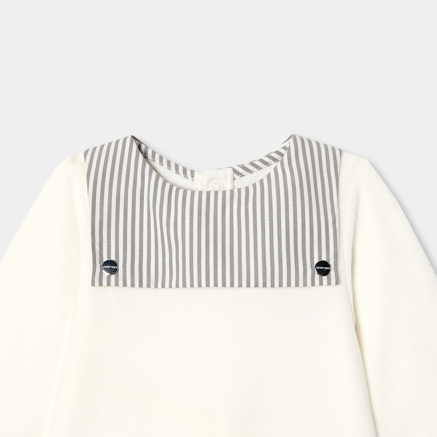 Emblematic of the Jacadi wardrobe, these baby pyjamas feature a striped poplin collar and decorative snaps. Made from soft, supple velvet, baby will fall asleep calmly in the comfort of these pyjamas. To give and pass on, slipped into the hospital bag and his first trousseau, here is a great idea for a birth gift.- Baby pyjamas in velvet- Navy collar in striped cotton poplin with decorative press studs- Invisible press stud opening on back- Ideal for the hospital bag