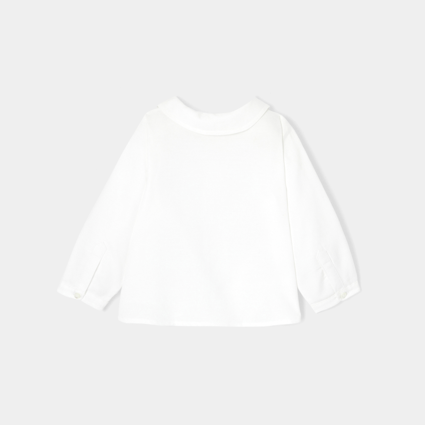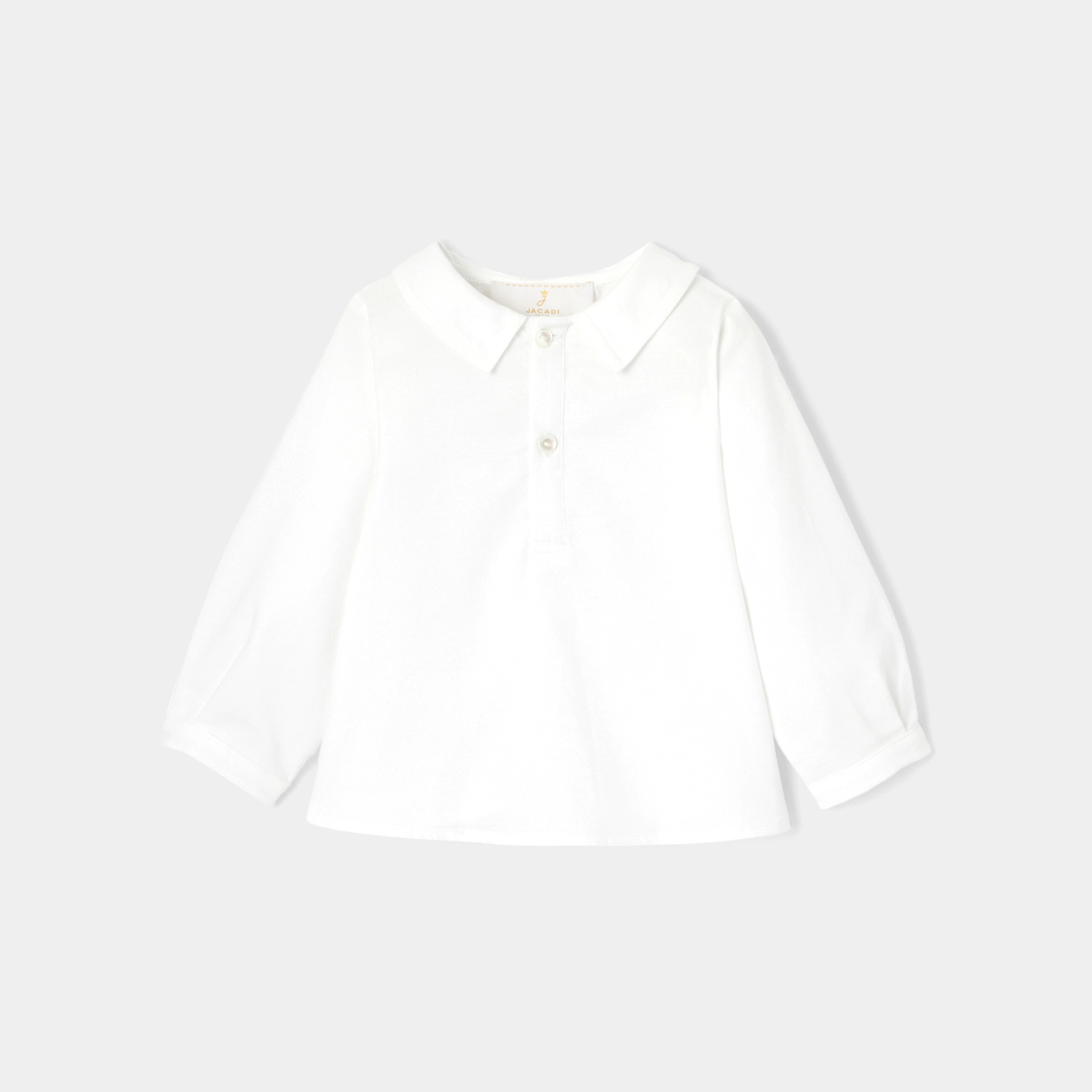 Chic, minimalist ceremony outfit with this baby boy shirt. A guimpe look, small collar, buttoning and front pleats complete this model in Oxford cotton. Ideal for dressy outfits, pair it with matching white trousers and ankle boots for the big day.- Organic cotton baby boy shirt- Collar and button placket--- Hollow pleats on the front