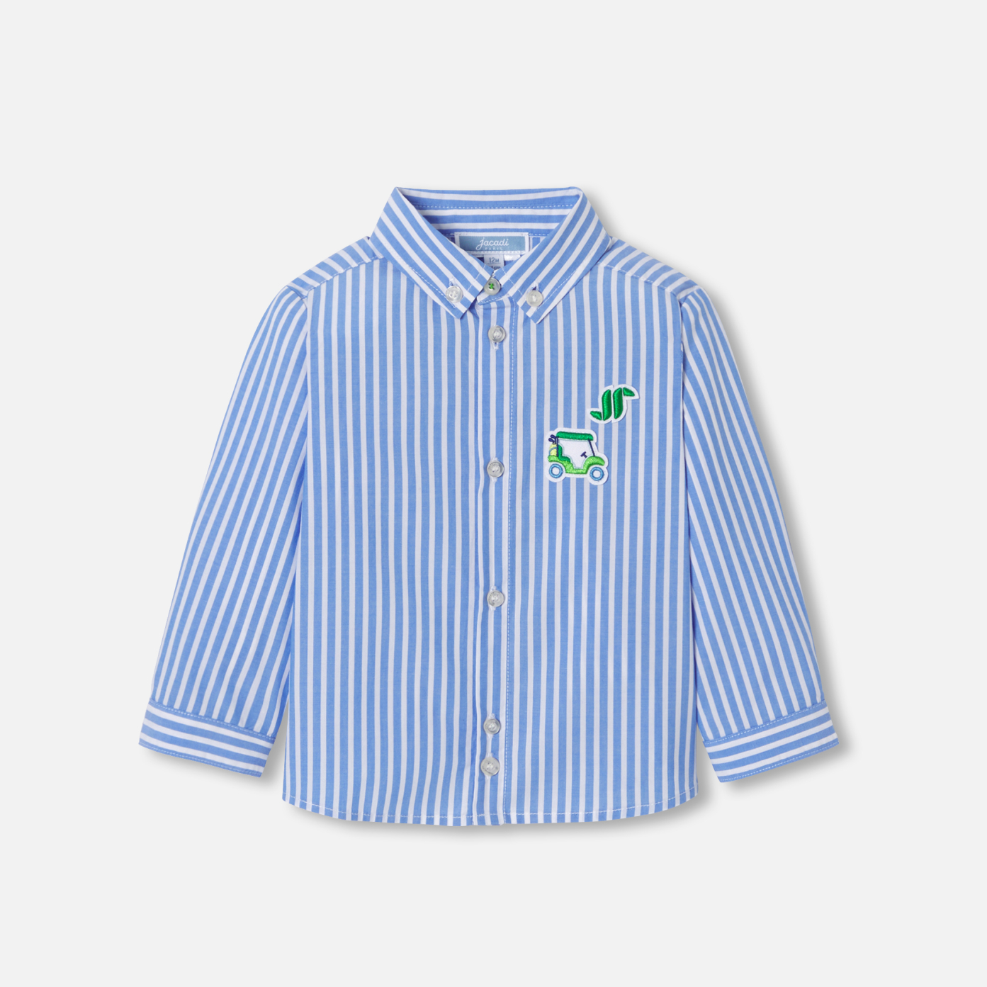 Worn open over a printed t-shirt with rolled-up twill trousers, the baby boy shirt is available in organic cotton for back-to-school. Striped and embroidered with a badge on the chest, it's sure to go with every look.- Organic cotton baby boy shirt- Yarn-dyed stripes- Badge on chest- Button opening