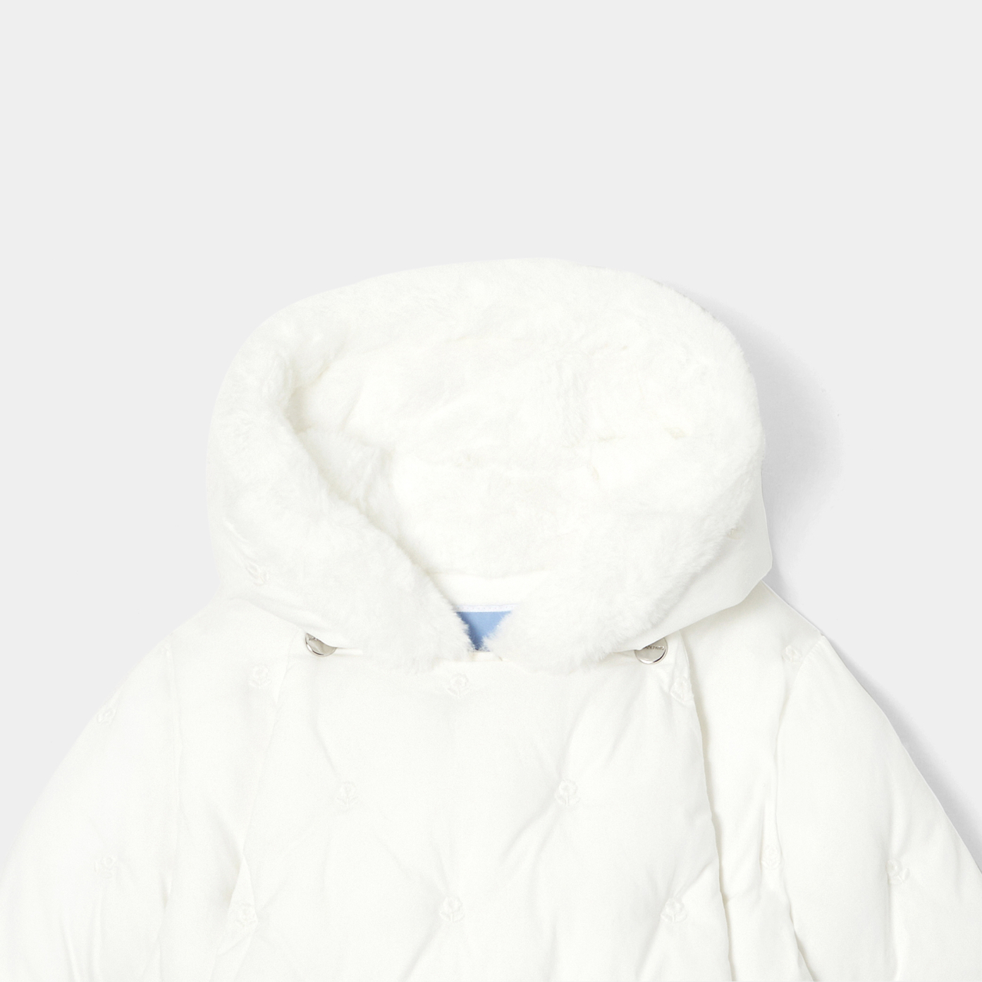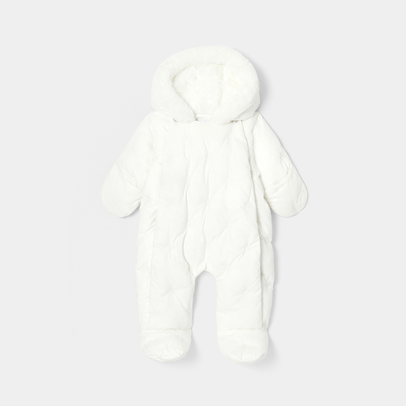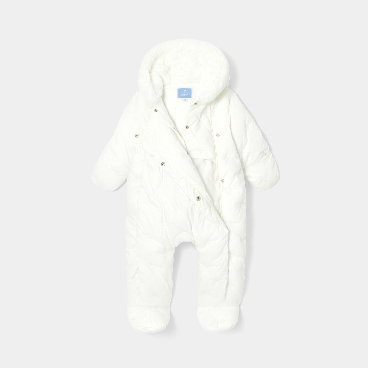 Choose the modernity and practicality of this baby pramsuit for winter. In soft and covering embroidered poplin, long sleeves with integrated mittens, faux fur lined hood and jersey lining will create a comforting cocoon around baby. Easy to put on thanks to its double zipped opening, this pramsuit is a great idea for a birth gift. - Technical poplin - Jersey lining - Faux fur hooded lining - Double zip opening - Integrated mittens- Repreve recycled fibre filling- Model without feet from size 18 months