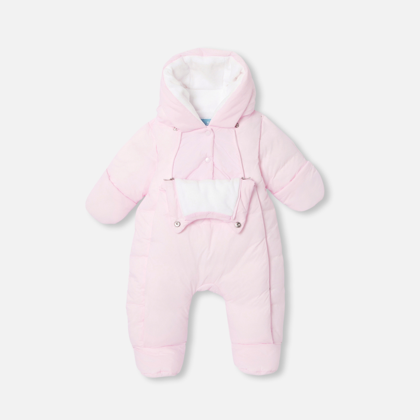 Whether in town or on the ski slopes, baby will be well protected from the cold with this plain pramsuit. Practical and easy to put on thanks to its double zip opening for secure dressing, an embroidered flower has been added to the bib. Soft and covering, long sleeves with integrated mittens, faux fur-lined hood and microfleece lining will create a comforting cocoon around your little one. This pramsuit is a great idea for a birth gift.- Lined pramsuit- Microfleece lining- Faux fur hood lining- Double zip opening- Integrated mittens- Recycled fibre padding- Model without feet from size 18 months.