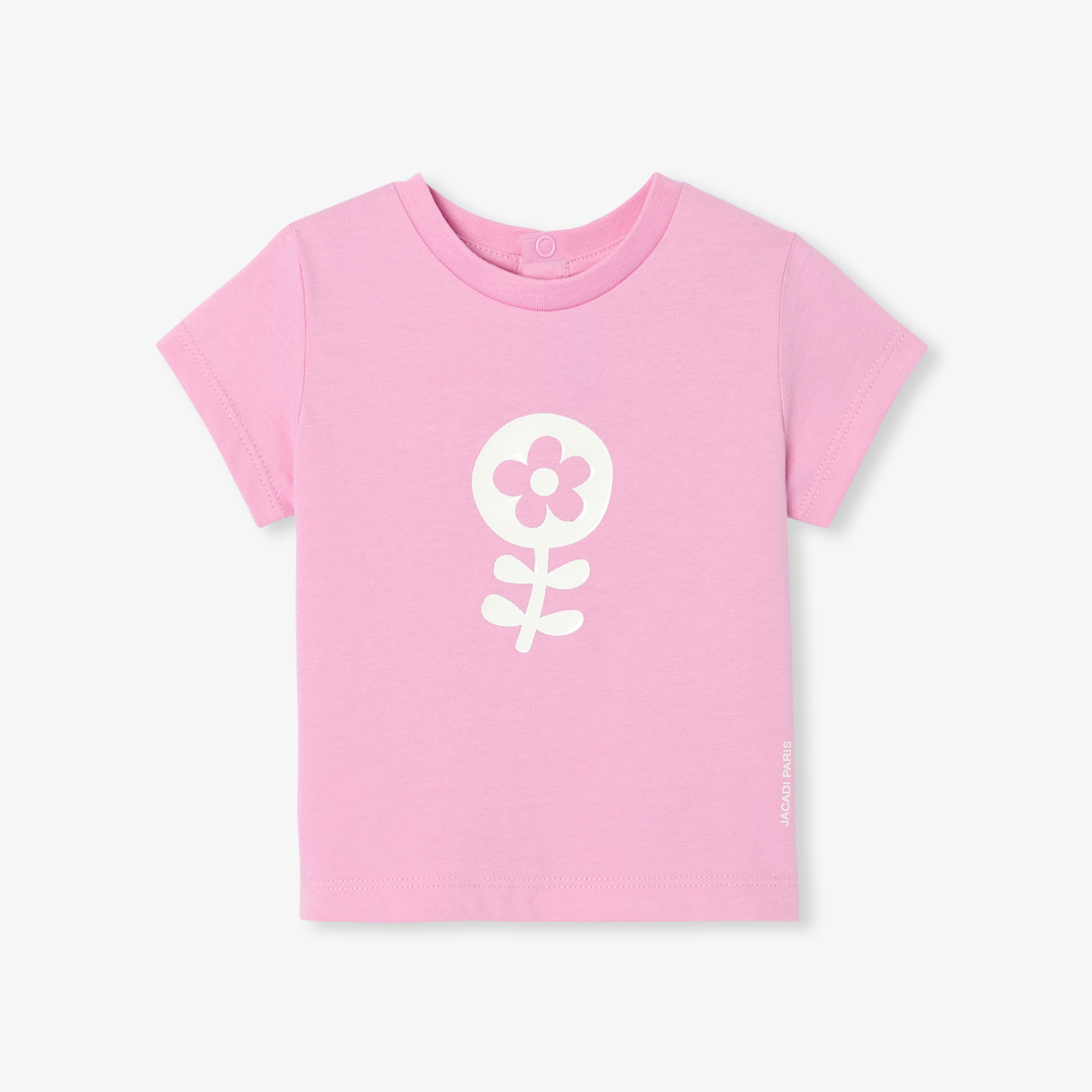 In organic cotton dyed bright pink, a geometric retro flower enlivens this must-have baby girl t-shirt. Paired with white trousers and trainers or honeycomb piqué shorts, it's sure to keep baby company all summer long.-Baby girl organic cotton short-sleeved t-shirt-Printed novelty motif on front-Snap closure on back
