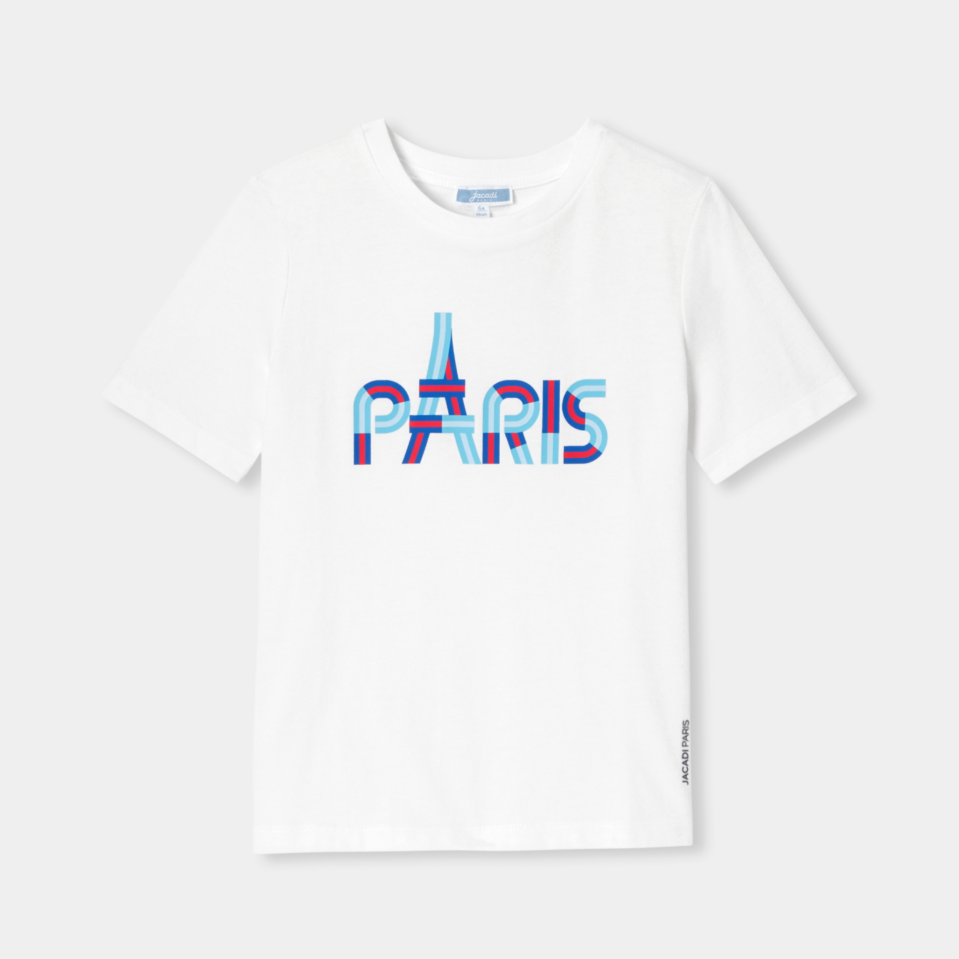 A daily wardrobe essential, this boy t-shirt shows his preference for Paris. Animated by a geometric message and a stylised Eiffel Tower, little city dwellers will wear it under a zip-up sweatshirt with rolled-up twill trousers and trainers for an urban look.- Boy T-shirt in organic cotton jersey- Round neck, short sleeves- Geometric animation on chest