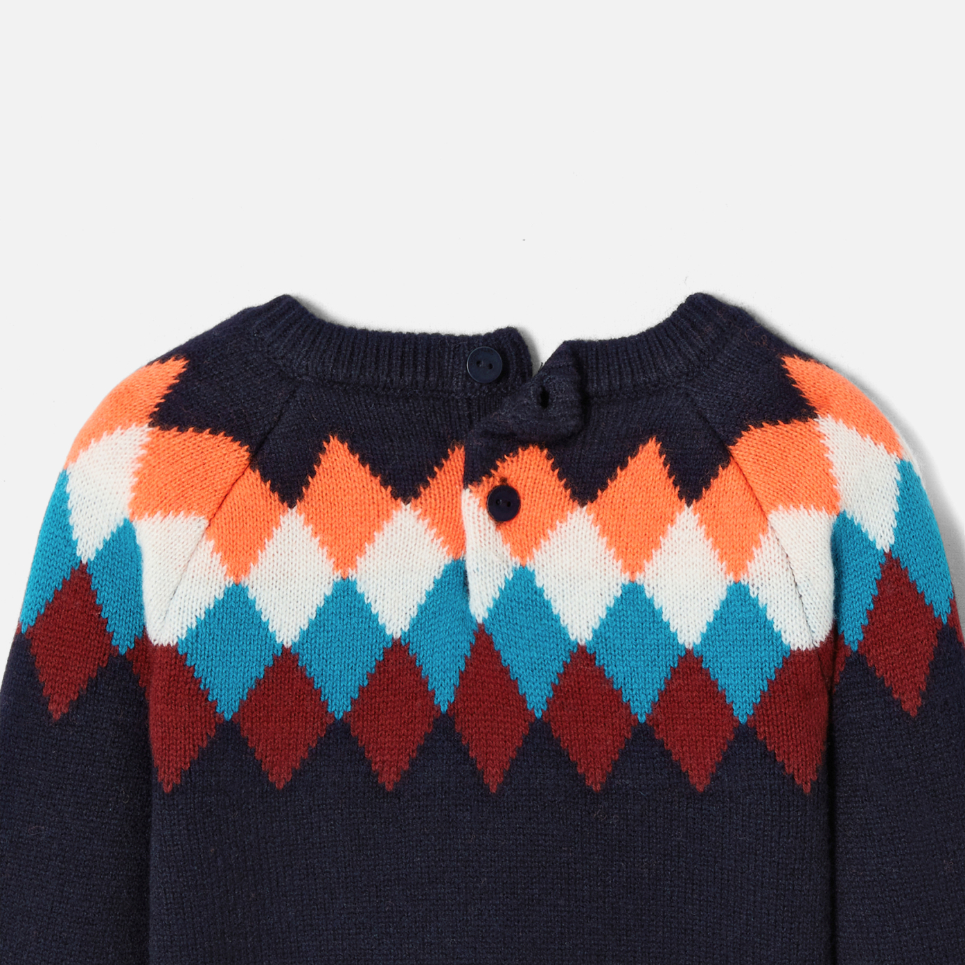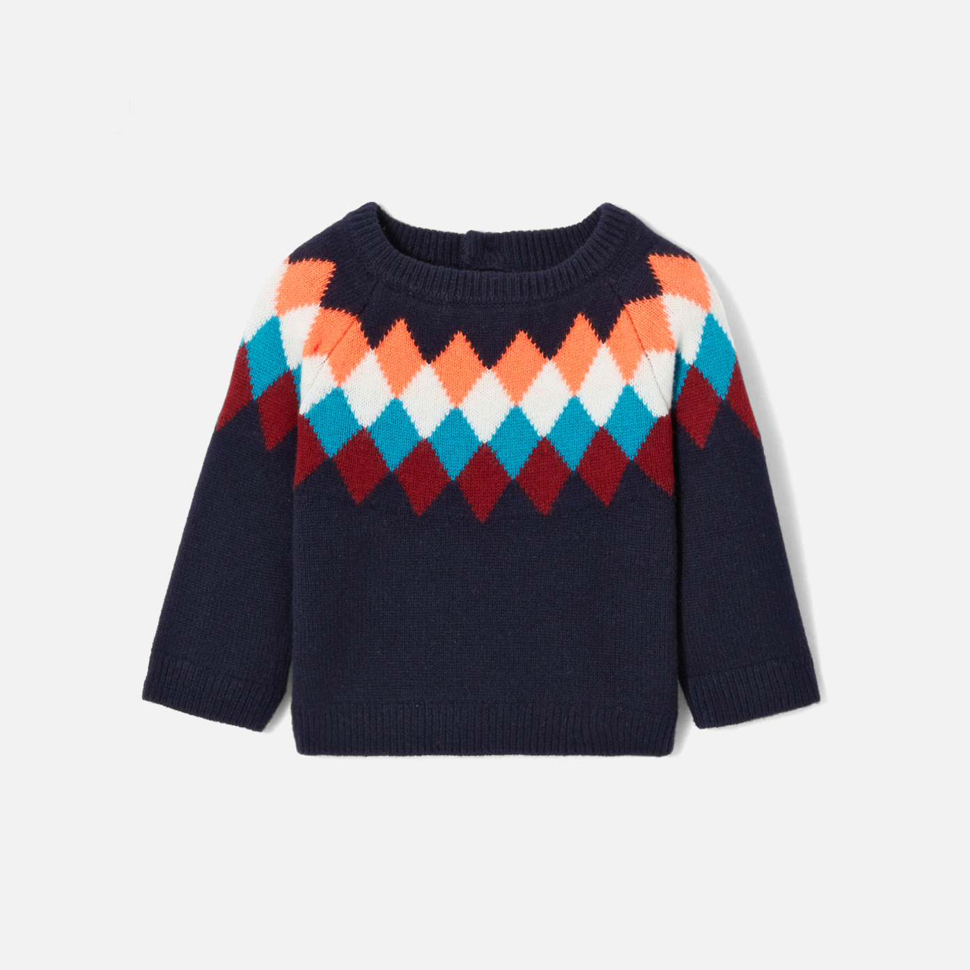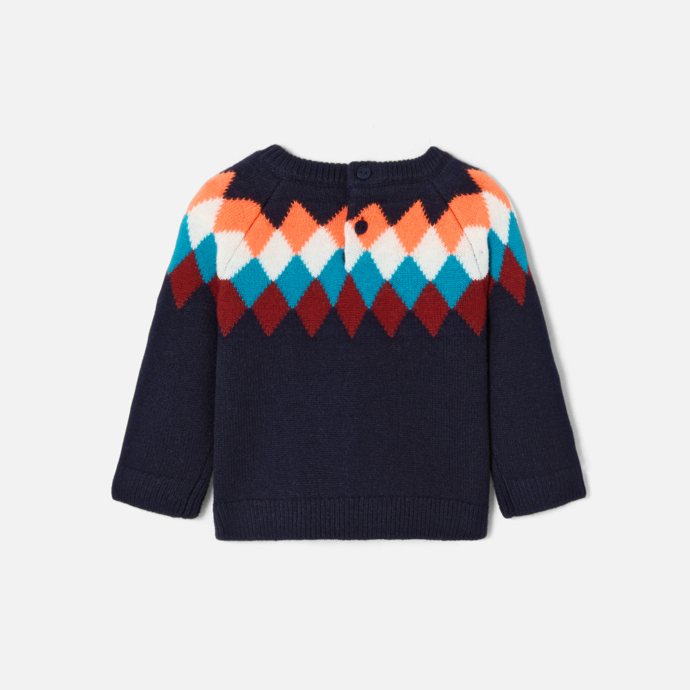 Nos stylistes revisitent le pull écossais pour en faire un modèle graphique et coloré. Modernisé d'un jacquard multicolore, il s'accordera parfaitement à un pantalon en velours orange et un blouson pour l'automne.- Laine responsable et cachemire- Jacquard multicolore- Ouverture boutonnée au dos